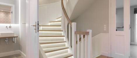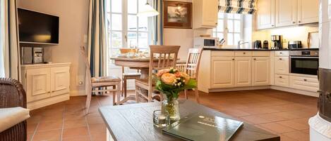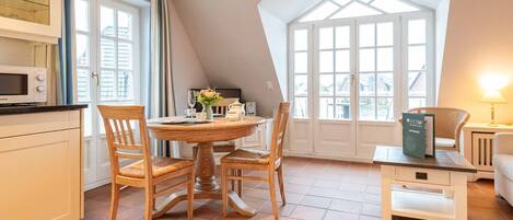 Seahorse Apartment From the large south-facing balcony, you can enjoy a stunning view over the rooftops of Wenningstedt all the way to the dunes. The Seahorse apartment, which was newly renovated in 2021, is located on the upper floor. After a short hallway, you'll find the large living-dining area. A separate fitted kitchen with all necessary appliances is located in front of the large window. The dining table is located in the elegant living area. The shower room with toilet is also on this level. Upstairs, you'll find the bedroom with a double bed and plenty of closets for your clothes. Pets are not allowed.
