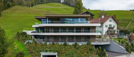 Sunny, modern mountain apartment with large balcony facing south-west centrally