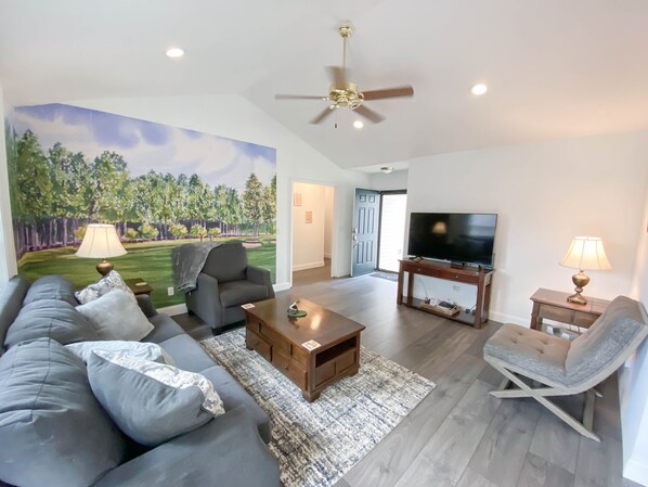Golf-Garage: HDTV that streams apps (Netflix, Amazon Prime, Disney+, ESPN+, etc.) and also has Sports channels, bar with stools, bistro set, shuffle board and curling game, professional practice 4x10 putting green, Hookey game, and 2 golf bag stands (holds 4 oversized bags) with storage.
