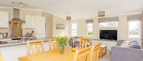 Excellent quality caravans with all the comforts of home. Accommodation comprises of one by double bed, two single beds and a double pull out sofa bed. All our Platinum caravan range feature double glazing, central heating a veranda and table and chairs. This property has the added feature of a Hot-Tub on the decking.