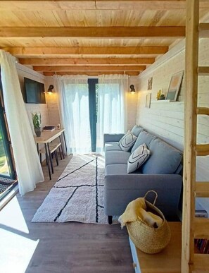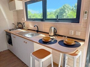 1 bedroom wooden caravan with pool and barbecue. sleeps up to 3 people