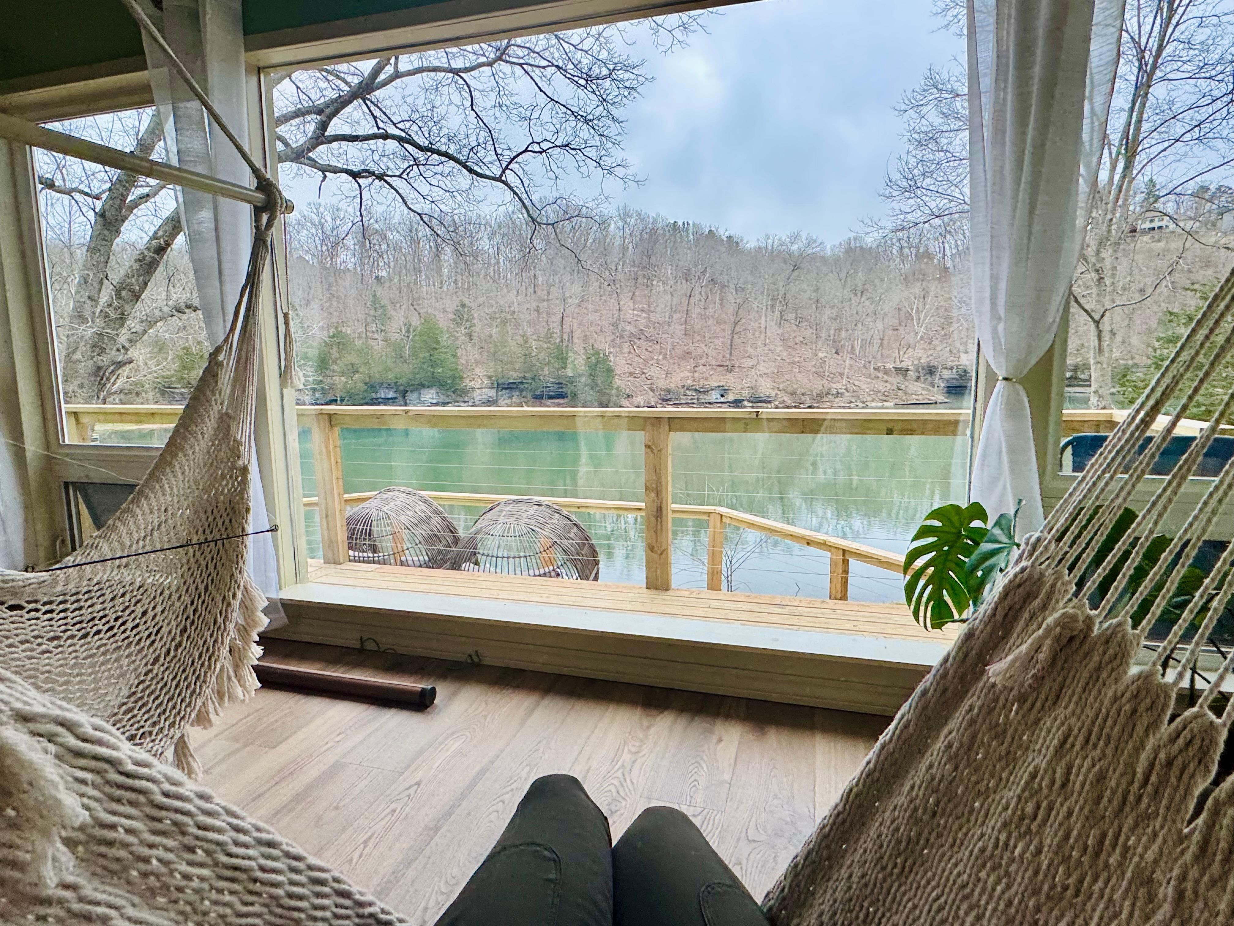 Panoramic glass wall with hammocks, dining table & over sized cozy chair all facing famous Lake Ann bluffs / lake while indoor in the AC or step outside onto the 2x deck & enjoy some tree covered shade or sunshine!