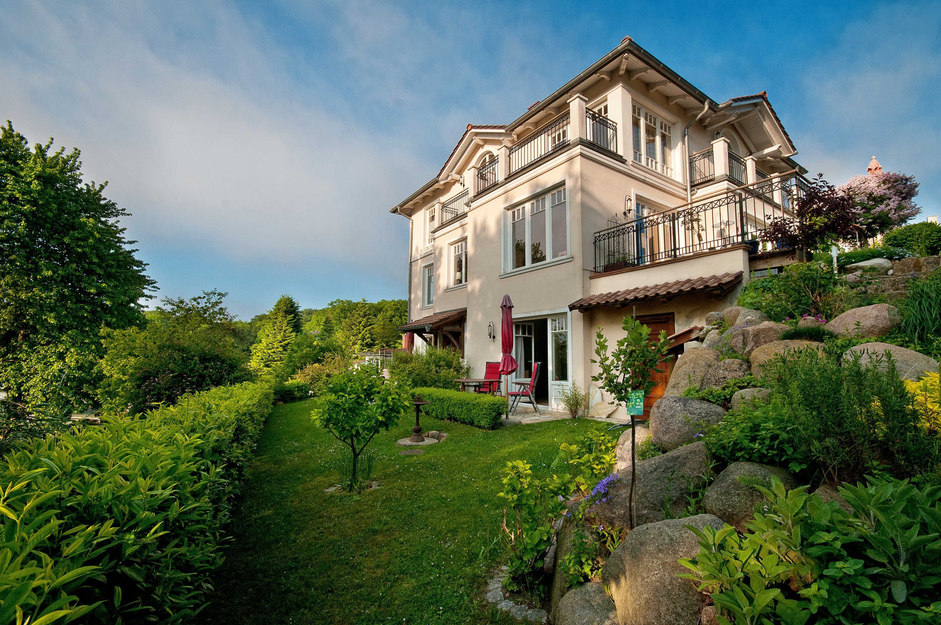 The Villa Amelie was built in Mediterranean-style in the quiet Amselweg. No neighbors except a few chirping blackbirds can look at the terrace of your apartment. Our apartments are well maintained, as new and individually furnished. Ecological building and a high quality of the facility were important to us. Mudstones, large wooden windows and a heat pump heating provide a comfortable indoor climate, the toilets are flushed with rainwater. All furniture is of high quality and made of real wood. Although the house was rebuilt, it retains a little residential charm by turn of the century with many details such as historic, lovingly restored doors (of course with safety interlock) or generous ceiling heights.