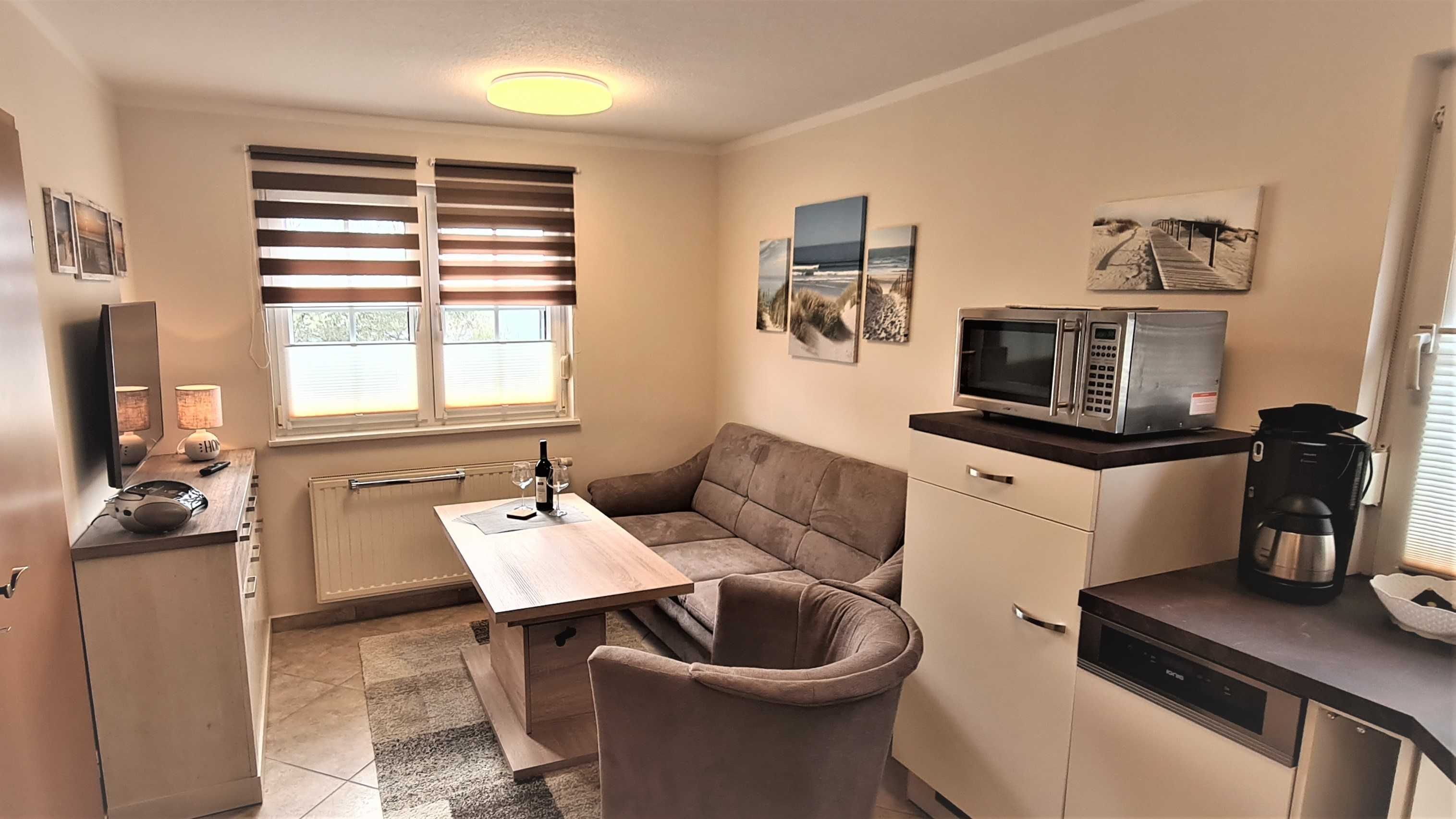 Equipment of the apartment 2: very bright, spacious and comfortable! Floor heating, laminate. Bedroom with double bed (180 x 200 cm), bundertjährigen three-part folding door to living / kitchen area with sofa bed, armchair, cable TV, DVD player, stereo. Bathroom with toilet and shower (120 x 90 cm), hair dryer and glass wall to the bedroom. Kitchenette with whispering refrigerator, dishwasher, ceramic hob, oven. Dining table for up to 6 people. Size approx. 44 m². Paved terrace to the west with furniture, barbecue and a small lawn. This apartment is suitable for 2 adults with up to 2 smaller children.