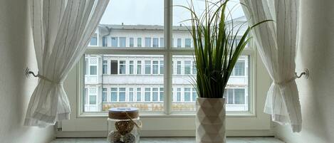 Your modern and lovingly furnished 2-room non-smoking apartment 14RB4 has a size of approx. 56 qm and is for max. 4 people. It is located on the ground floor and on the back of the villa. A south-west facing winter garden invites you to linger and relax all day in your own beach chair. The bright and high quality furnished apartment is divided into a hallway with a cloakroom, cozy living room with an additional modern wall bed for the 3rd and 4th Person, dining area and complete eat-in kitchen as well as a separate bedroom with a large double bed and first-class box spring mattresses for a restful sleep, additional flat-screen TV and wardrobe with mirror as well as a bathroom with a washstand, toilet and shower. The technical equipment in the living room includes a 48-inch flat-screen TV, a stereo system with CD player, DVD player and a selection of DVDs for bad weather days and free WiFi access. The kitchenette is fully equipped with a dishwasher, ceramic hob, oven, refrigerator with freezer, microwave, coffee machine, kettle, toaster and extensive kitchen inventory. The apartment's own storage room offers additional storage space for your suitcases or beach utensils. There is also a travel cot and high chair available for our little guests. All around a first class furnished apartment to switch off from everyday life and enjoy the vacation. The communal storage room in the house offers two bicycles to explore the surrounding area. A free parking space is available directly at the house.