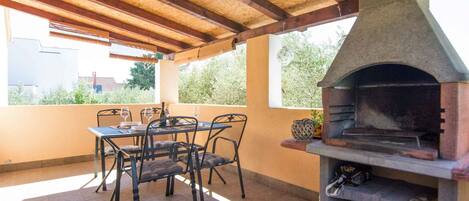 Have breakfast outside on the large, covered terrace and barbecue local specialities in the evening. The built-in stone barbecue gives you the opportunity to prepare authentic dishes. As the sun slowly sets and a pleasant evening breeze blows, the gentle chirping of the cicadas accompanies you - the perfect soundscape for a successful day on holiday.
