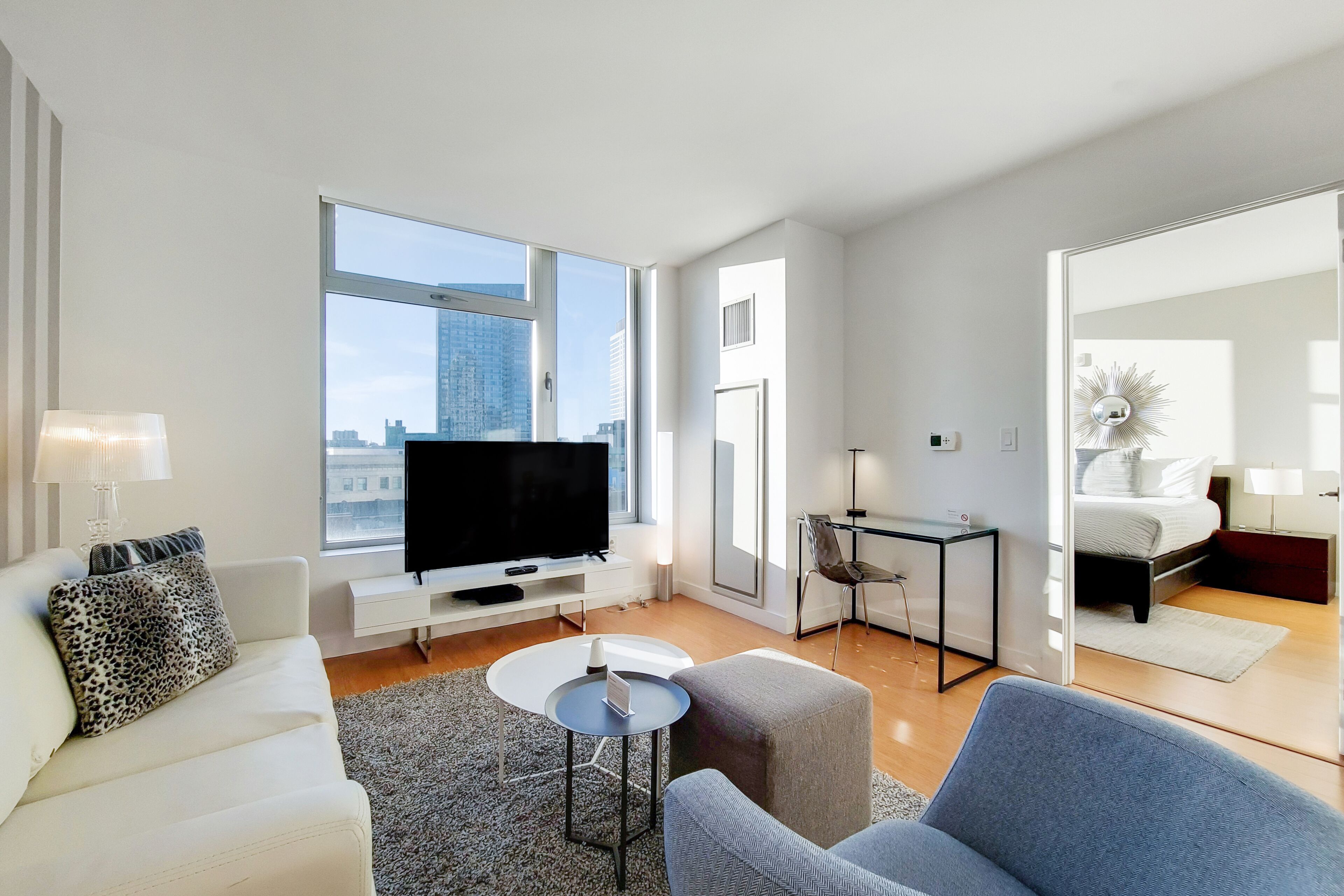 This newly designed one-bedroom apartment features floor-to-ceiling windows, hardwood floors, granite counter-tops, upgraded stainless steel appliances and front-loading washer/dryer in the residence. All beds provided are fitted with plush linen sheets and pillows. All Furnished Quarters apartments include 24/7 guest service.