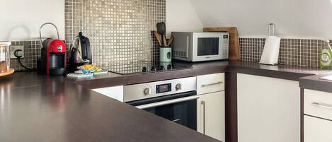 Kitchen - Oven / ceramic 4-burner hob, fridge/freezer, built-in microwave, washing machine, wine fridge.