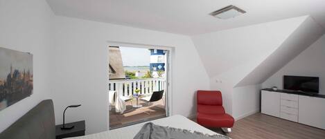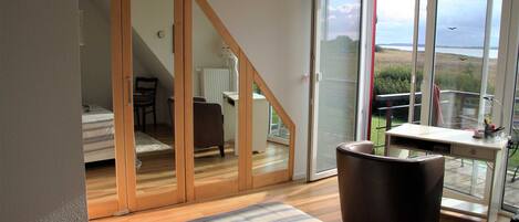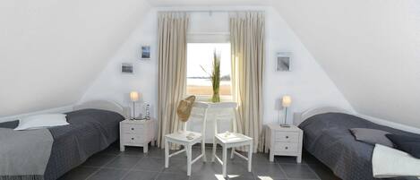 The house has three bedrooms. On the ground floor there is a bedroom with a single bed. One upstairs bedroom has a large double bed, the other has 2 single beds. A cot can be added on request. Plenty of storage space for your holiday wardrobe is available in all bedrooms. Equipment cottage coasts: SaunaKaminWLANKĂŒche with microwave, toaster, dishwasher2 bathrooms with WC and Dusche3 Flatscreen TV'sTerasse with garden furniture and parasolElectric grillBaby travel bed / highchairWashing machine 3 bedrooms
