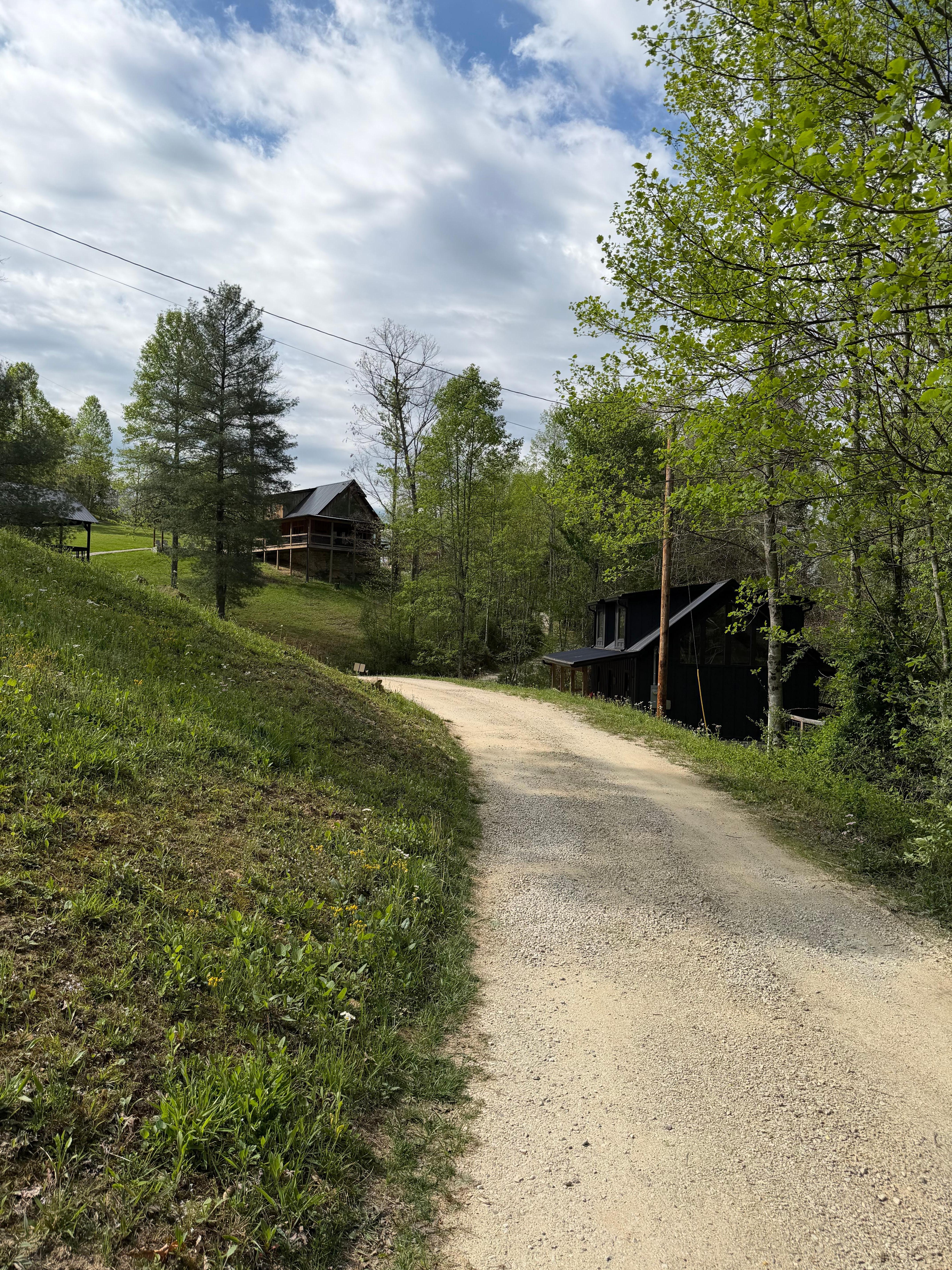 Gravel driveway leading to cabin. There are dedicated parking spots directly in front of cabin.
