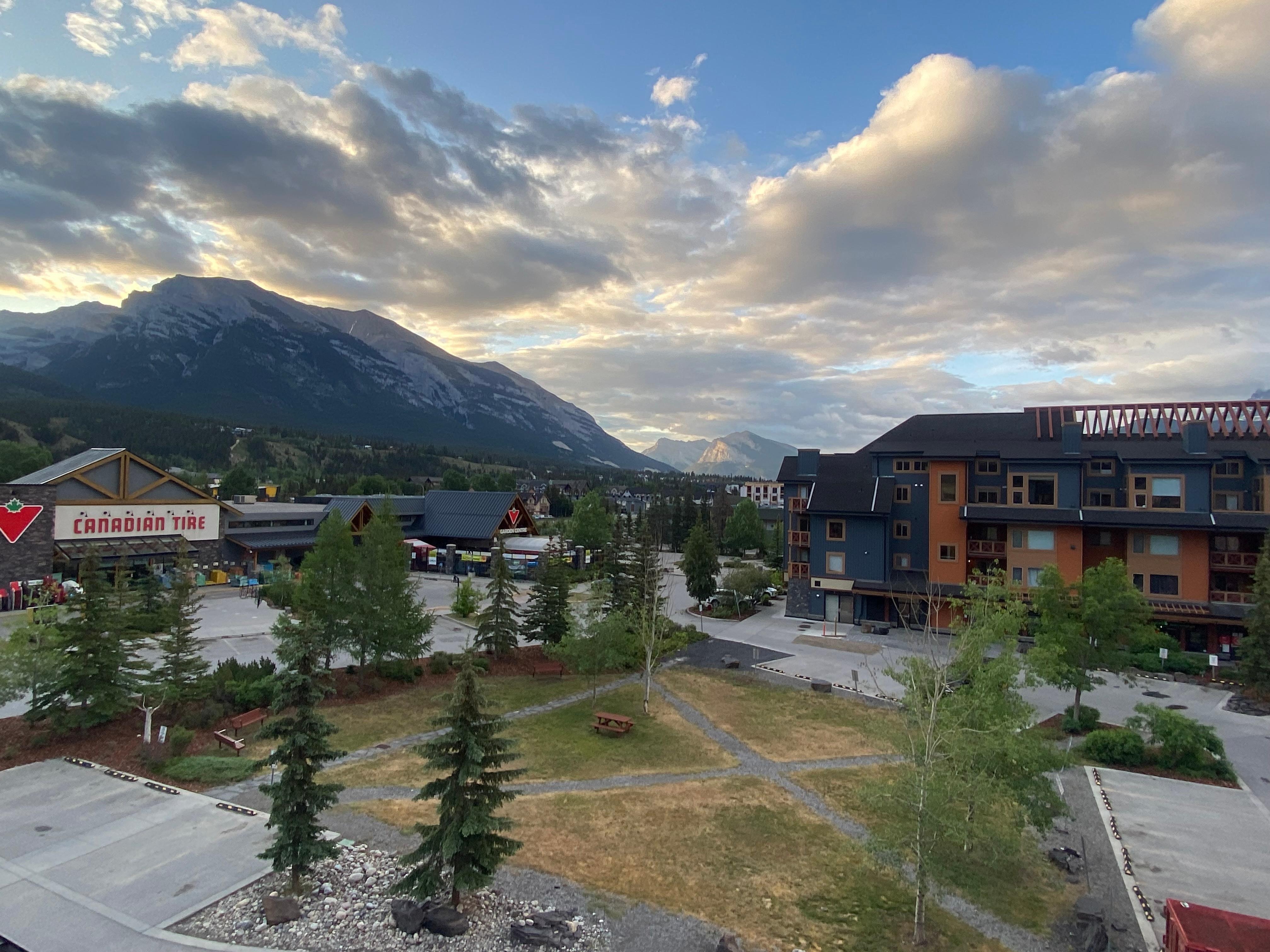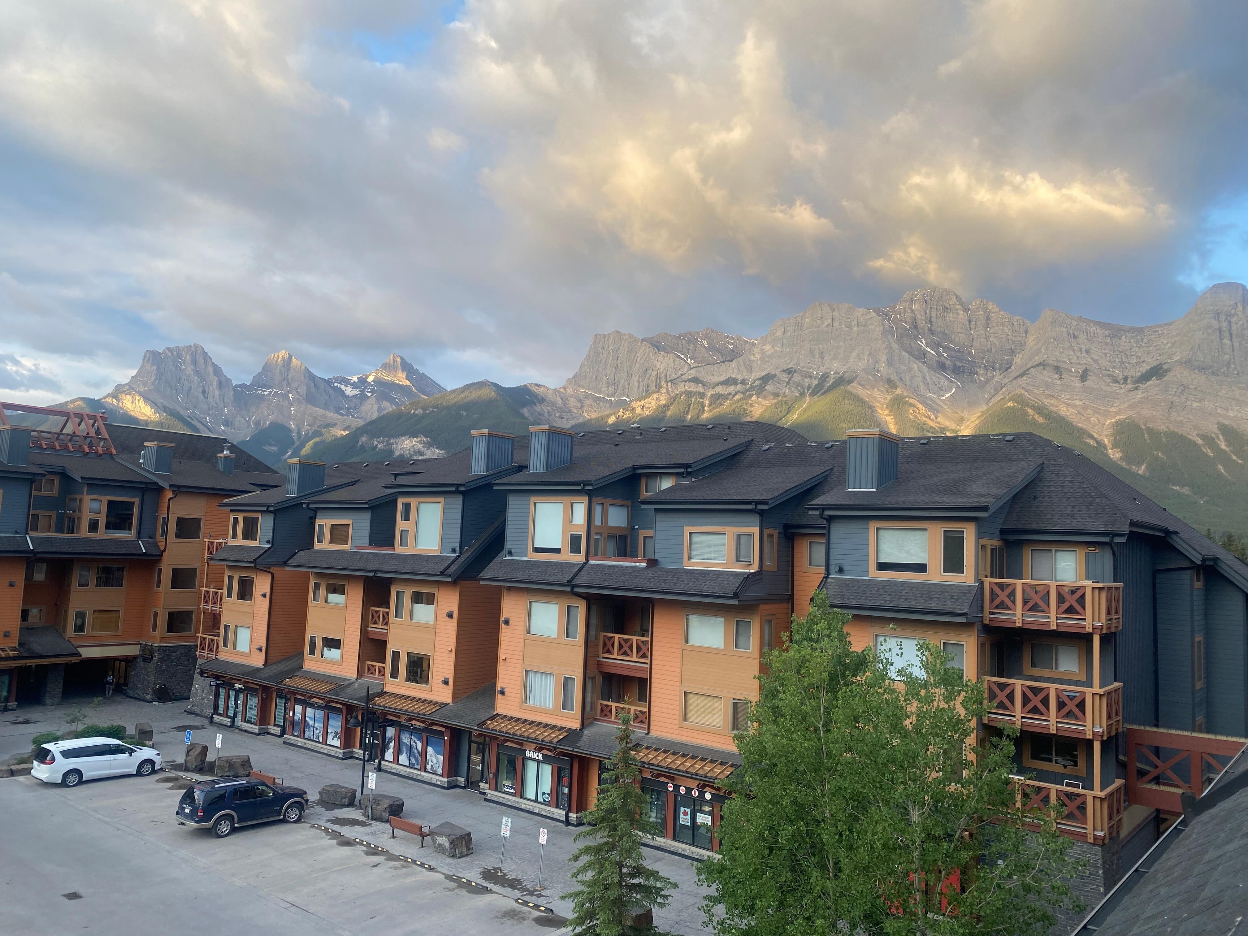 All windows have a stunning view of the famous Three Sisters mountains. The best times are the sunrise when the pink rays hit on the peaks from the east and the sunset when the orange rays hit on the peaks from the west.