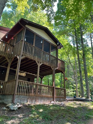 The cabin is tastefully furnished and features: two bedrooms (one queen and two twins), one bathroom, central AC/heat, wi-if, fireplace, eat-in, fully equipped kitchen with dishwasher, living room, laundry room with washer and dryer. Screened porch and open deck overlooking two ponds. Just bring your personal items, food and adventuresome spirit.