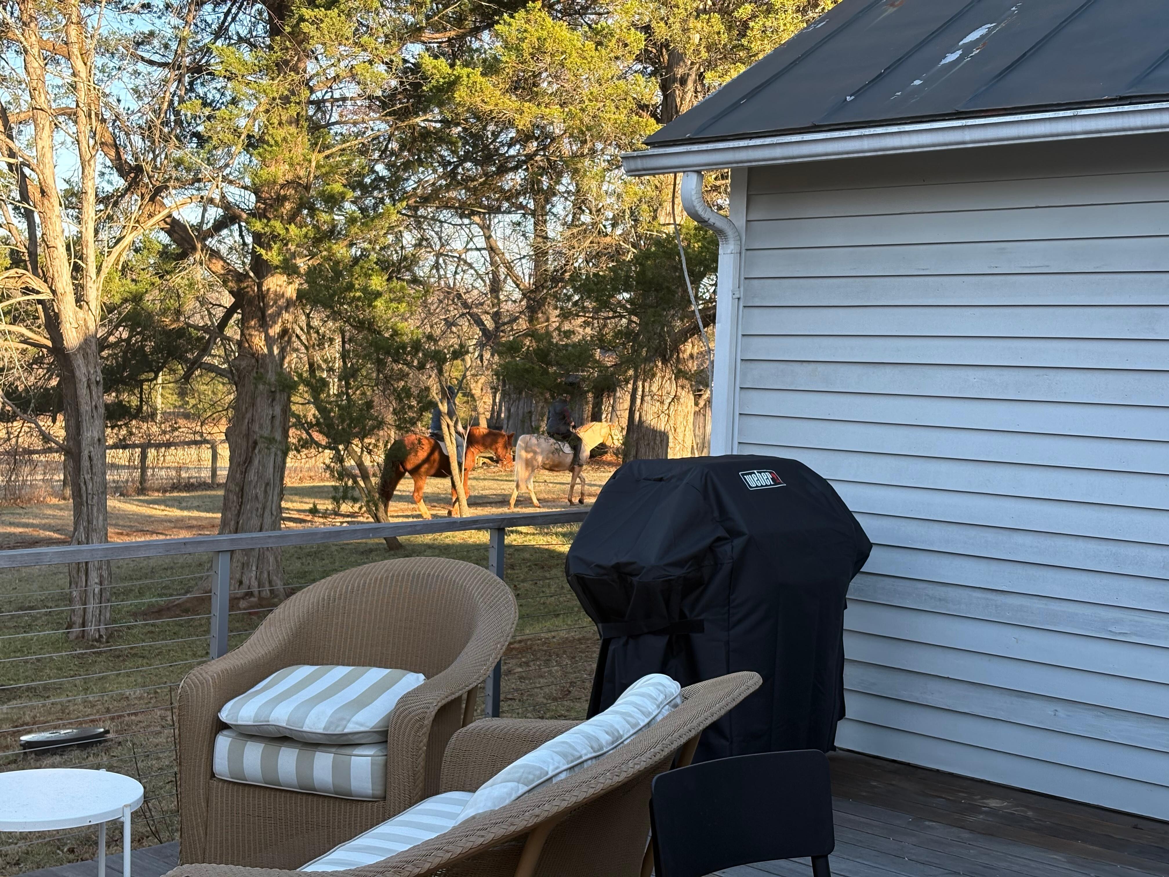 Newly remodeled! This peaceful cottage is located behind the main house on the property and affords guests complete privacy. The welcoming covered front porch and the expansive deck that wraps the entire back of the cottage and around one side has multiple seating areas for you to enjoy nature at her finest! The property overlooks the pastures, your closest neighbors will be the resident horses - or maybe even a zebra! Fully furnished with two bedrooms with king beds and 2 full baths. Open concept in the center of the cottage, with beams, ceiling fans and gallery lighting. A large soft sofa is also suitable to nap on! Gas cook stove, dishwasher, washer and dryer. A gas fireplace adds charm and cozy warmth to the living room. Wi Fi, outdoor gas grille, full deck out back overlooks the farm and back fields.