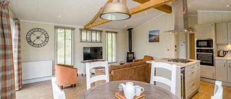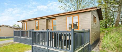 Nestled amongst the trees this luxurious lodge is ideal for a break with family or friends. Featuring a spacious open-plan living space with large Flatscreen TV, comfy sofas, modern kitchen with breakfast bar and elegant dining area. Comfortable master double bedroom with en suite bathroom and two well-sized comfortable twin rooms, one with en suite bathroom, along with a spacious family bathroom with bath and overhead shower. The French doors lead to decking area with garden furniture ideal for al fresco dining. Please note: If you are intending on bringing a pet with you, please select a pet using the pet filter during the booking process, as the resort must be made aware of this in advance.