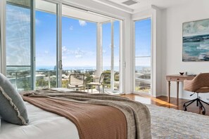 Bedroom 1 â Main: King bed, luxurious ensuite, balcony with ocean views, office desk & chair