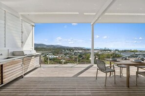 At Coastal Panorama, every detail is designed to make the most of its extraordinary setting. The home captures spectacular views of the ocean, mountains, and coastline, with the expansive balcony providing the perfect vantage point for sunrise coffees or sunset drinks. This outdoor space is complete with a built-in BBQ, dining table, and sun lounges, inviting you to linger and entertain in the open air. Inside, the open-plan living area features a comfortable lounge and large TV, with floor-to-ceiling glass doors that flood the space with natural light and allow the sea breeze to flow through. The modern kitchen is thoughtfully equipped with everything needed for holiday cooking, from a generous island bench with stools to a full suite of utensils, along with the all-important Breville Bambino coffee machine for barista-style mornings. The main bedroom is a true retreat, offering a king bed, balcony access, ocean views, and a dedicated work desk for those who need to study or work while away. Families will love the kidsâ room with its twin king singles and games, and the whole home provides plenty of space for everyone to relax. Parking is also easy, with the option of using the garage or the convenient on-street spaces nearby.
