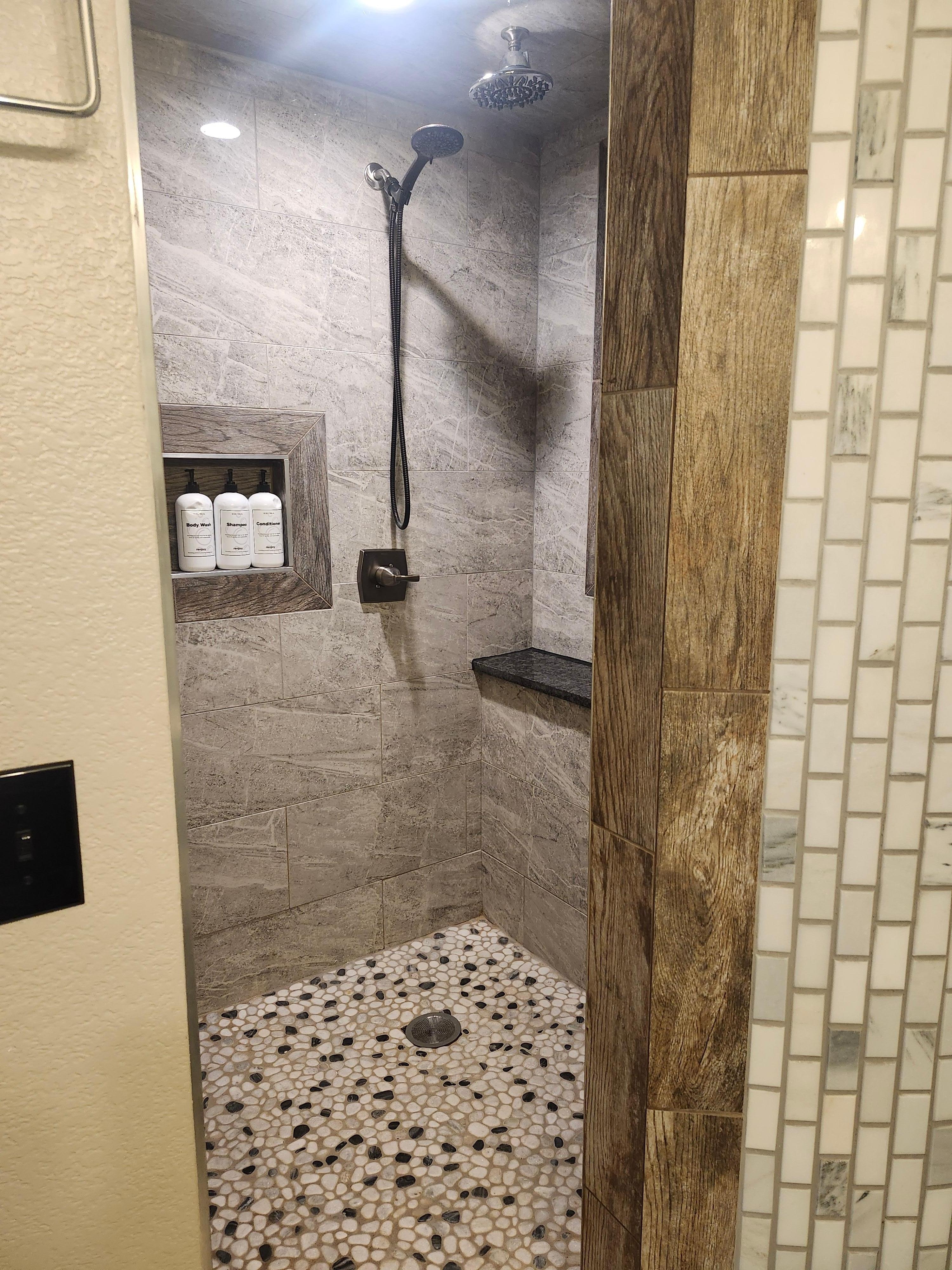 Featuring two vanities, a large deep bathtub, and beautiful tile work throughout. Itâs fully stocked with a hairdryer, soft plush towels, shampoo, conditioner, body soap, and even face wipes and feminine products for any last-minute needs.