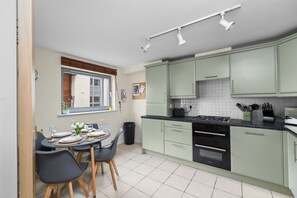 Inside, the flat is thoughtfully equipped to meet the needs of both short breaks and longer stays. The main bedroom features a king-sized bed, while the second offers a small double - ideal for a couple, friends or a family of three or four. The modern bathroom includes a shower over the bath.