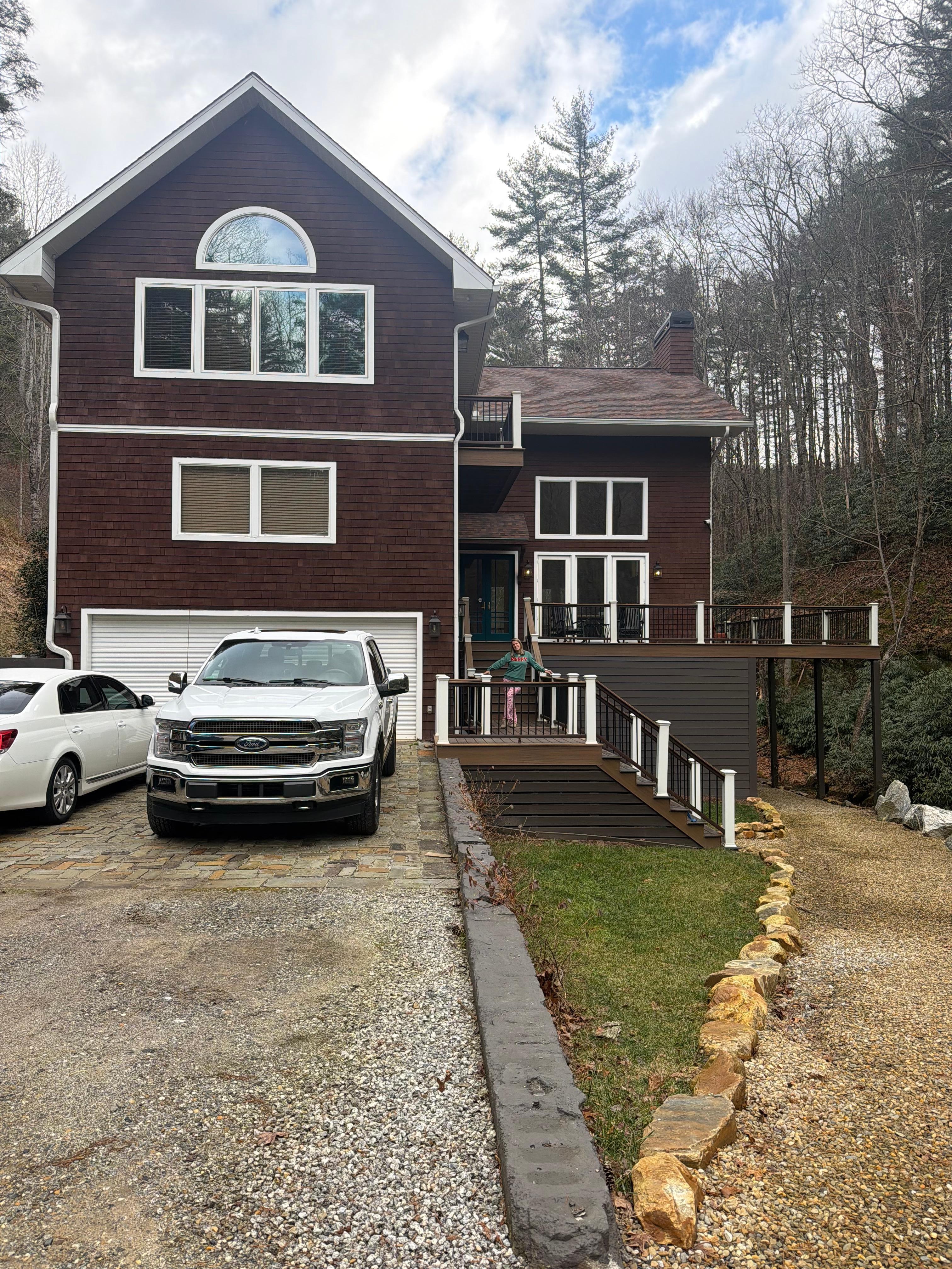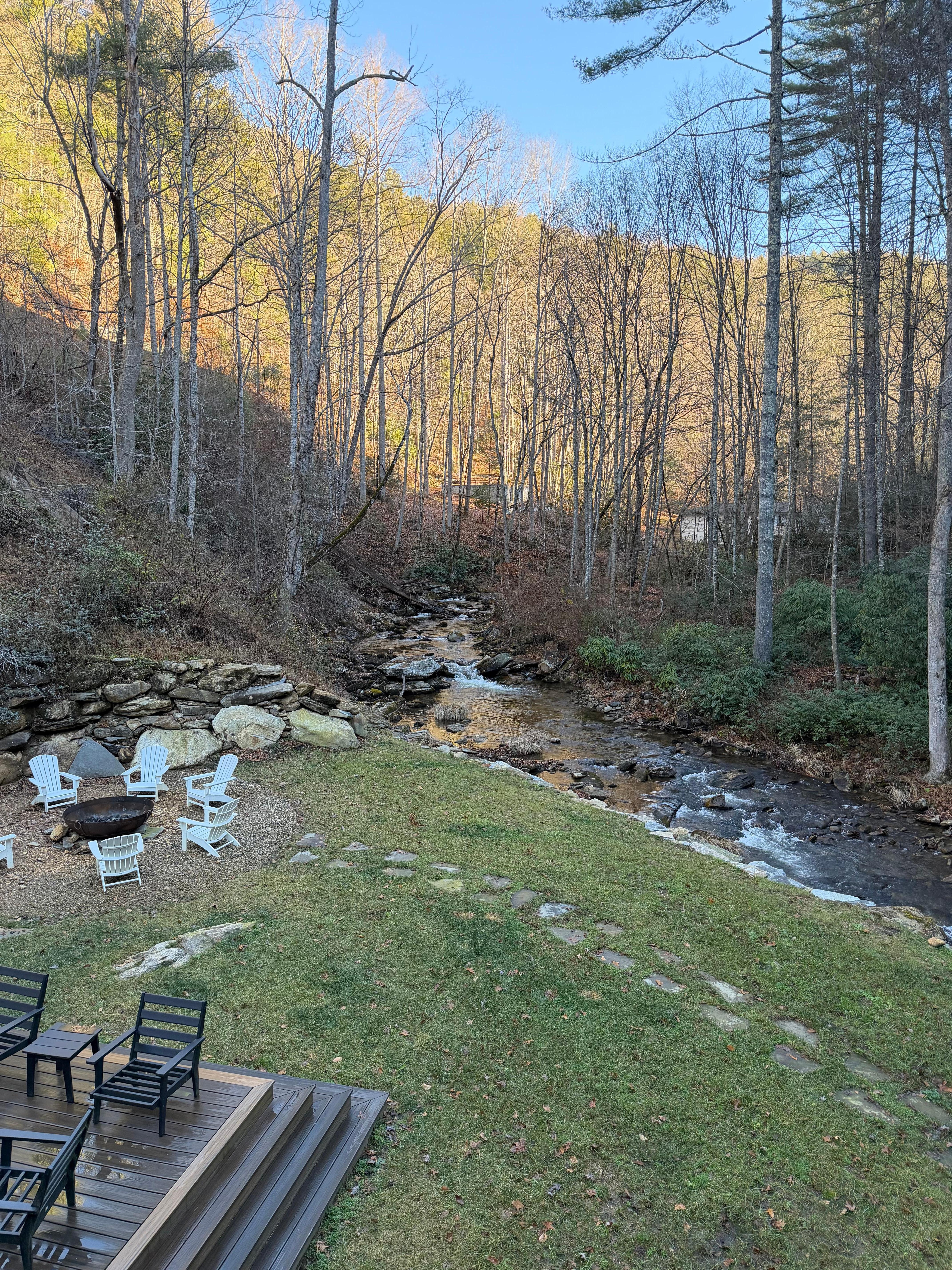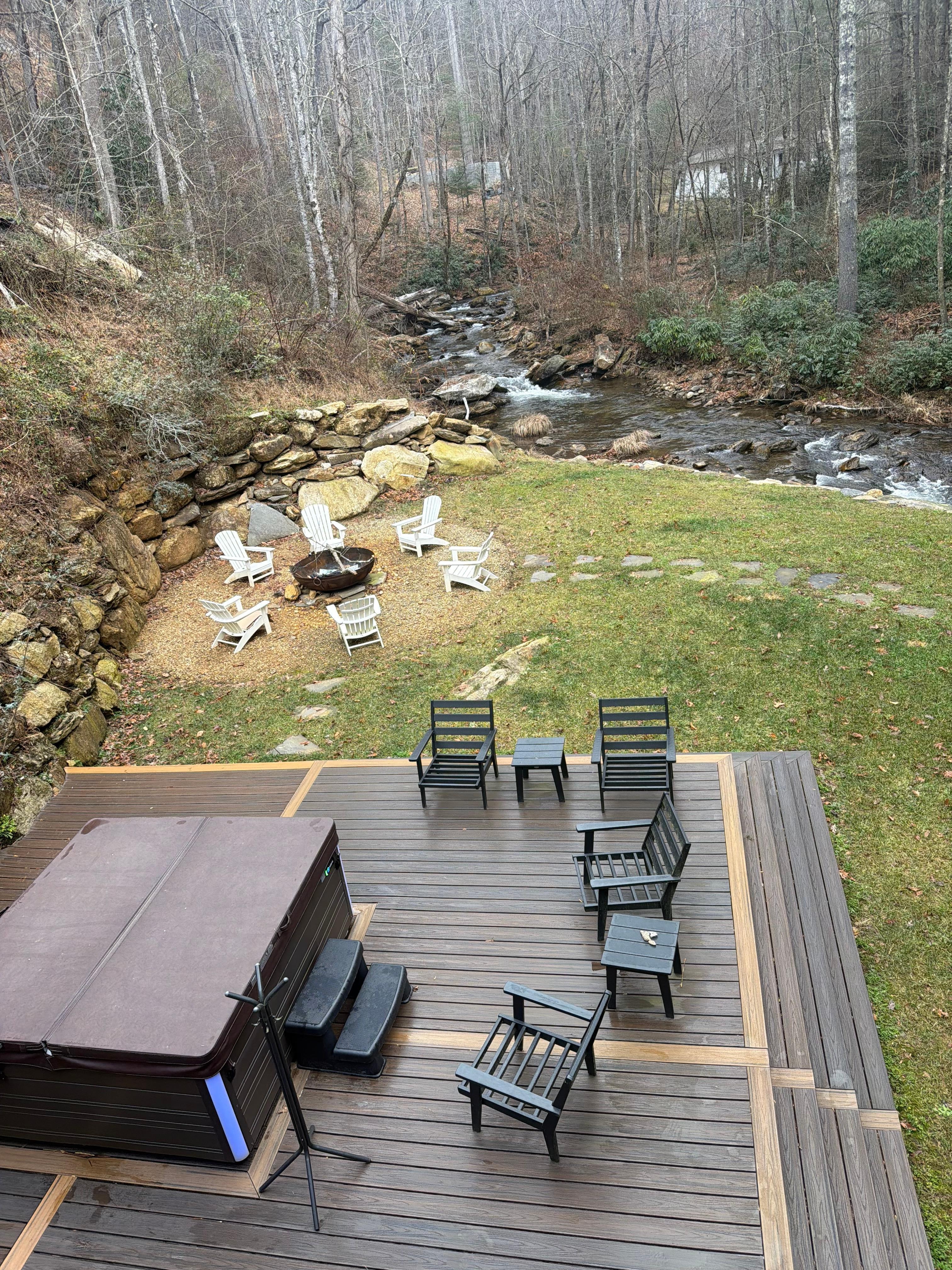 Escape to this beautiful, 4000+ sq foot house in picturesque Highlands. This amazing property boasts 4 bedrooms (2 upstairs master suites) with 2 king beds and 2 queen beds, and a bunk bed in the downstairs game room. Three full bathrooms and two half baths feature luxurious amenities like jetted bathtubs. The large main floor living area is anchored by a floor to ceiling wood burning fireplace. The downstairs has 2 bedrooms with queen size beds and a full bath. An additional living space/game room downstairs is equipped with a pool table, ping pong table, game table and large screen TV, wine cooler and half bath. The large chef's kitchen is equipped with upscale Dacor double ovens, Sub Zero side by side refrigerator, 6 burner gas cooktop, 2 drawer dishwasher and a wine cooler. It is fully stocked with all cookware and dinnerware. After dinner relax on the furnished wrap around porches listening to the creek, in the hot tub on the back deck or enjoy the fire pit which is perfect for s'mores with the kids. Conveniently located 20 minutes from Highlands and 15 minutes from Franklin. This fantastic house is perfect for families or groups of friends looking for a cozy retreat. Kickback, relax, and enjoy everything Highlands and our house has to offer. Exterior security cameras. Driveway is steep and all wheel drive recommended in inclement weather.