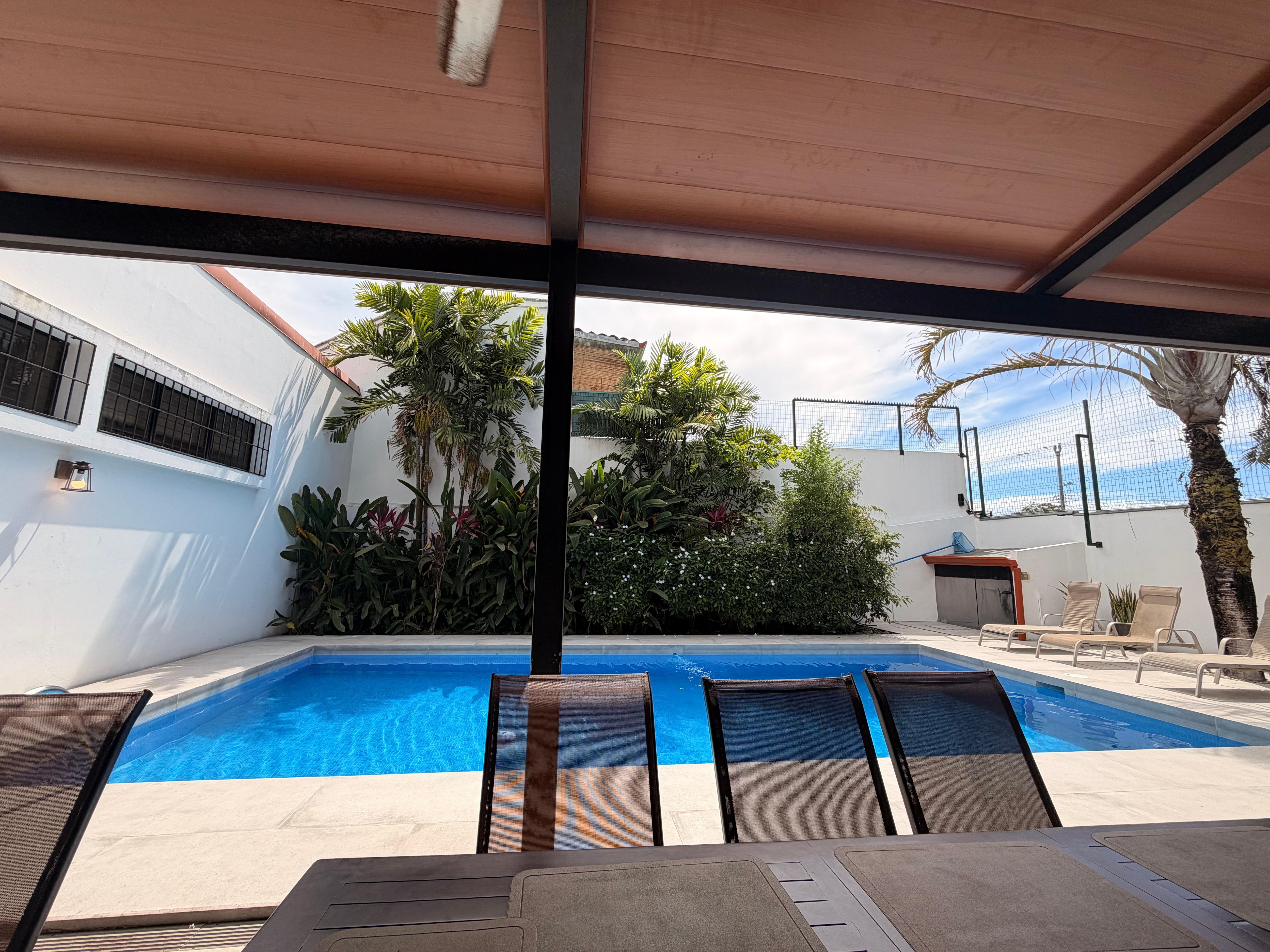 Architectural designer's home on quiet residential street, 6-minute walk to center, 7 to beach. Spacious, secure house with large private pool, thatch-covered terrace with table for 10. All bedrooms with TV, ensuite bathrooms.