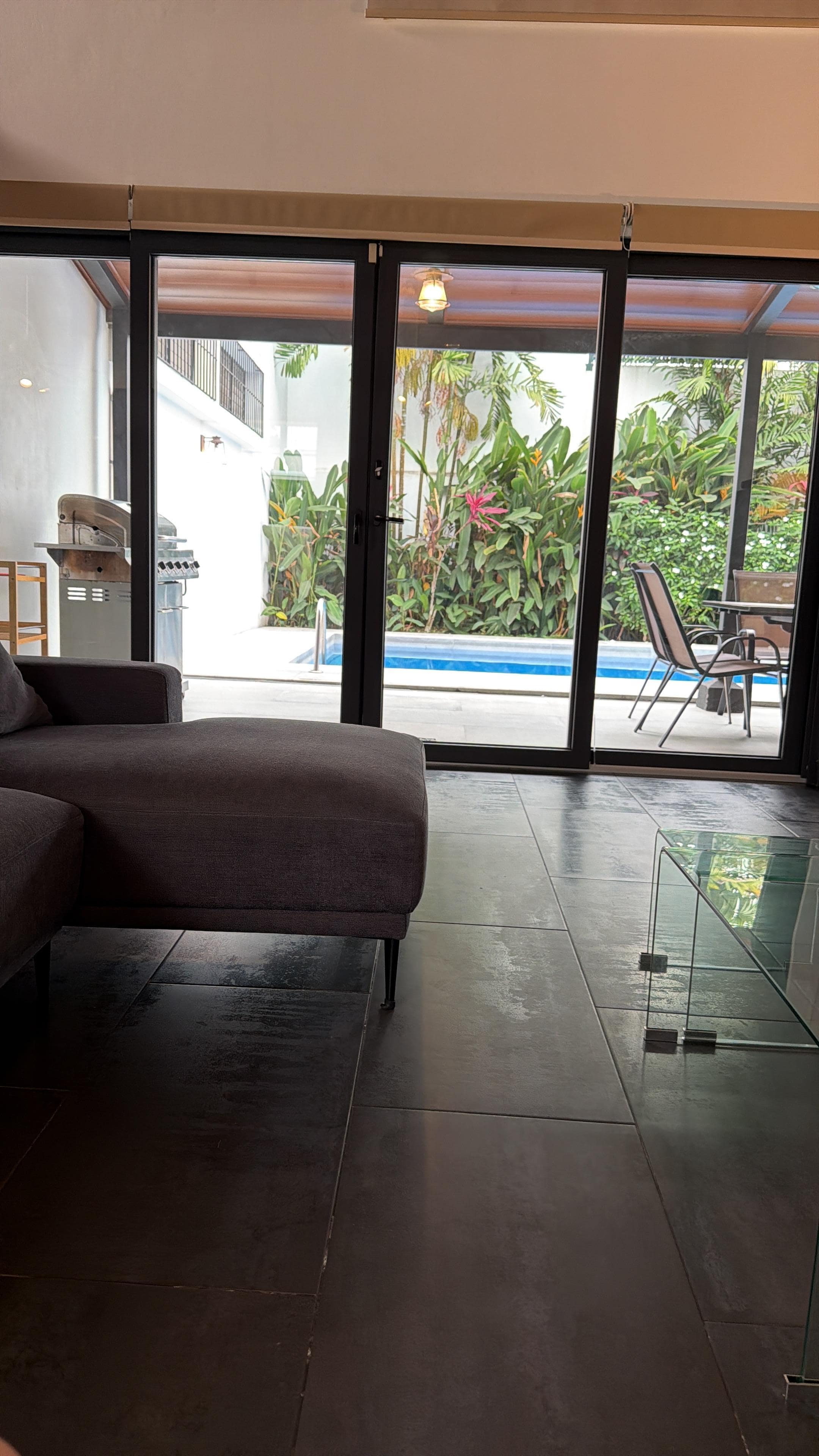 There are two large bedrooms, which we call apartments, are inside the property and are connected to the main house and pool area via an interior walkway. They have one full bed and two and three Twin beds respectively. Both apartments have flat screen smart TVs, ensuite bathrooms and closet space with safe deposit box.
