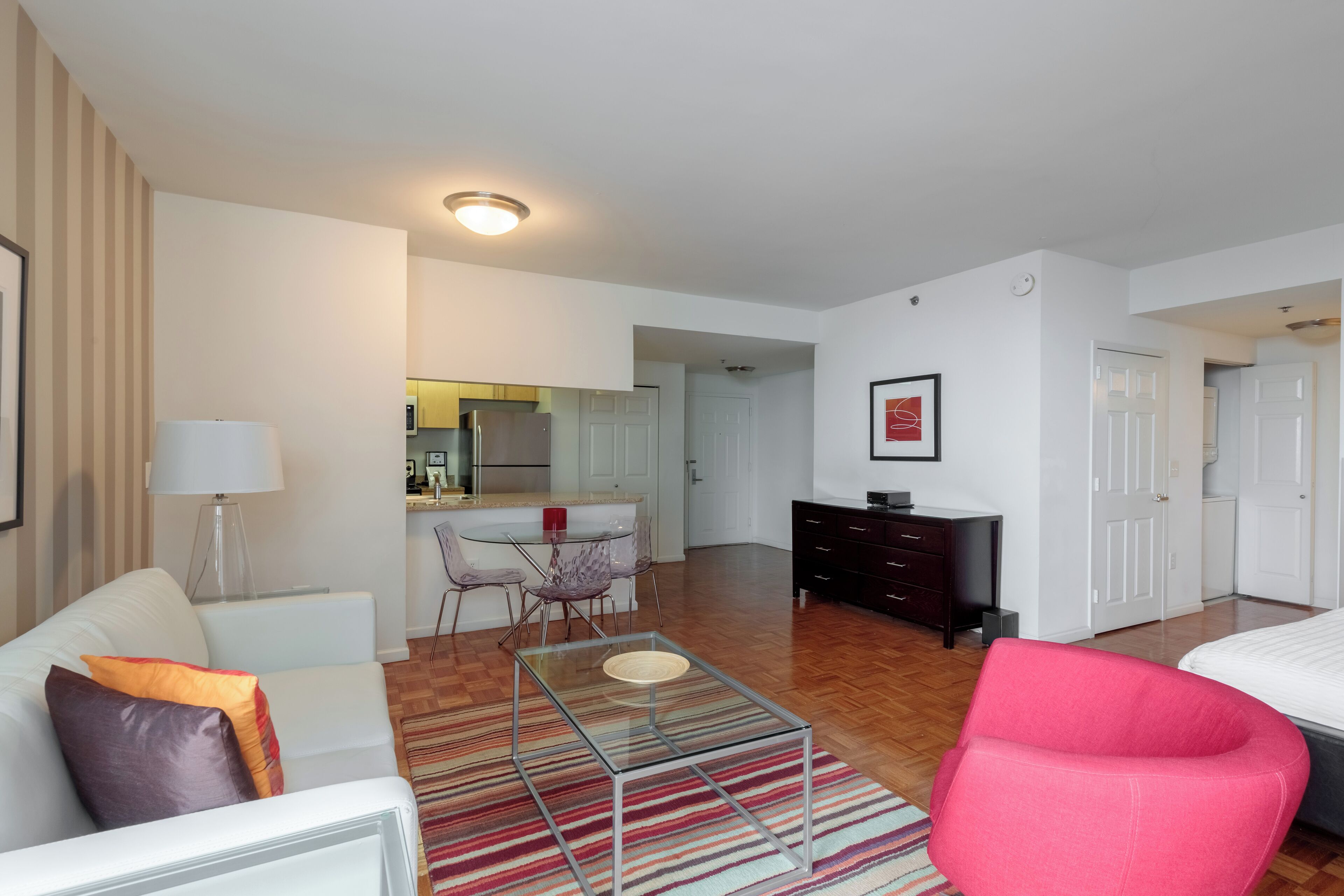This modern one-bedroom apartment features a fully equipped kitchen with stainless steel appliances and granite floors/countertops and an in-unit washer/dryer. Building amenities include a 24-hour doorman, state-of-the-art fitness center, outdoor swimming pool and resident lounge. All beds provided are fitted with plush linen sheets and pillows. All Furnished Quarters apartments include 24/7 guest service.