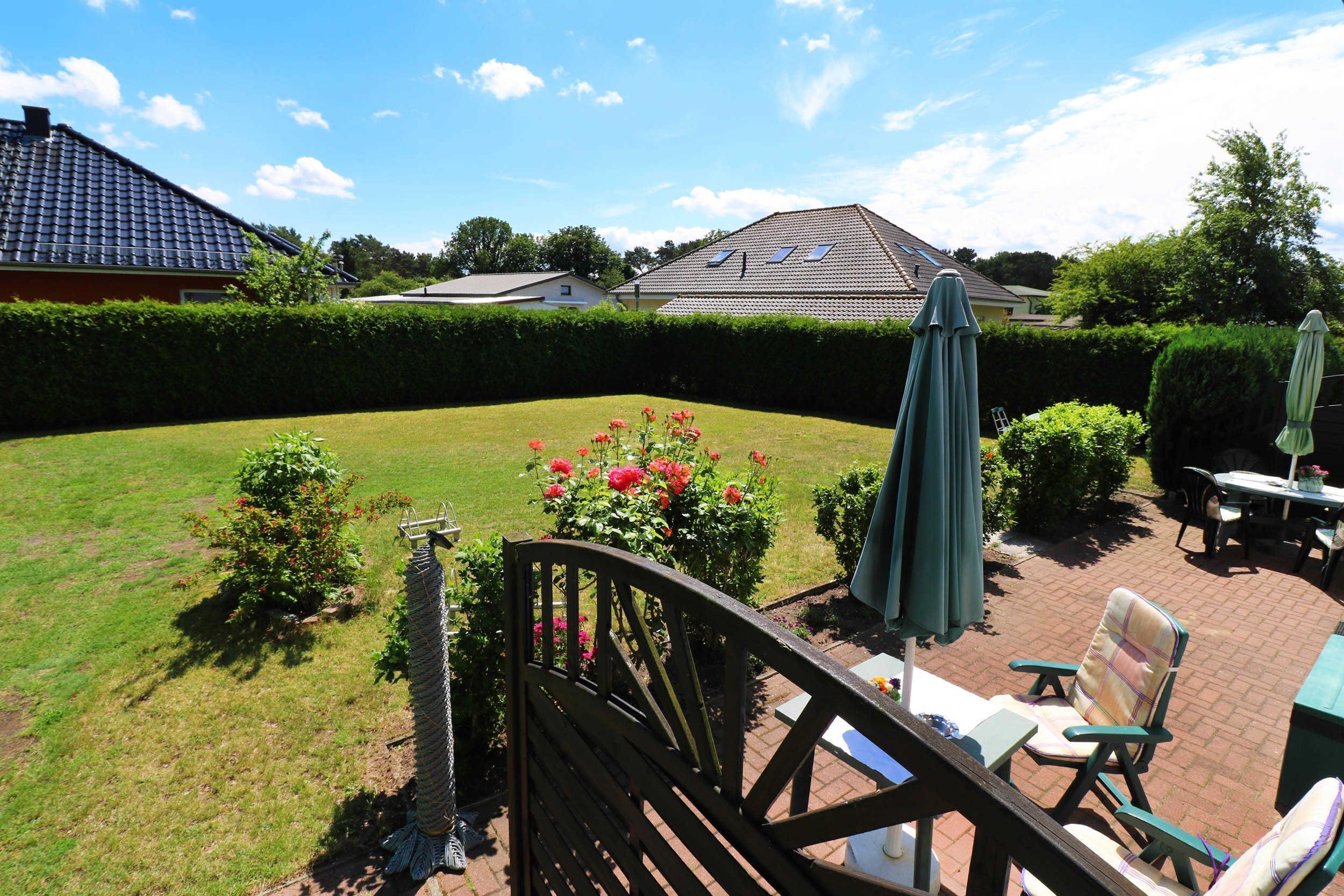 The one-room apartment is equipped with a sleeping area separated by a parapet with double bed (2 times 90/200) and wardrobe. In the open living area there is a sofa, with SAT-TV and hi-fi system. In the kitchen and dining area you will find a small kitchenette with oven, stove, refrigerator, coffee machine, crockery and a dining table with 3 places. In the garden of the house is a terrace, which you can use. Breakfast and the laundry package are not included but can be booked.