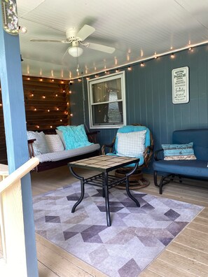 Your safety is important, the yard is fenced and secure and it is a no smoking property. The enclosed covered porch is cozy and complete with a swing, glider and ambiance that includes string lighting & throws.