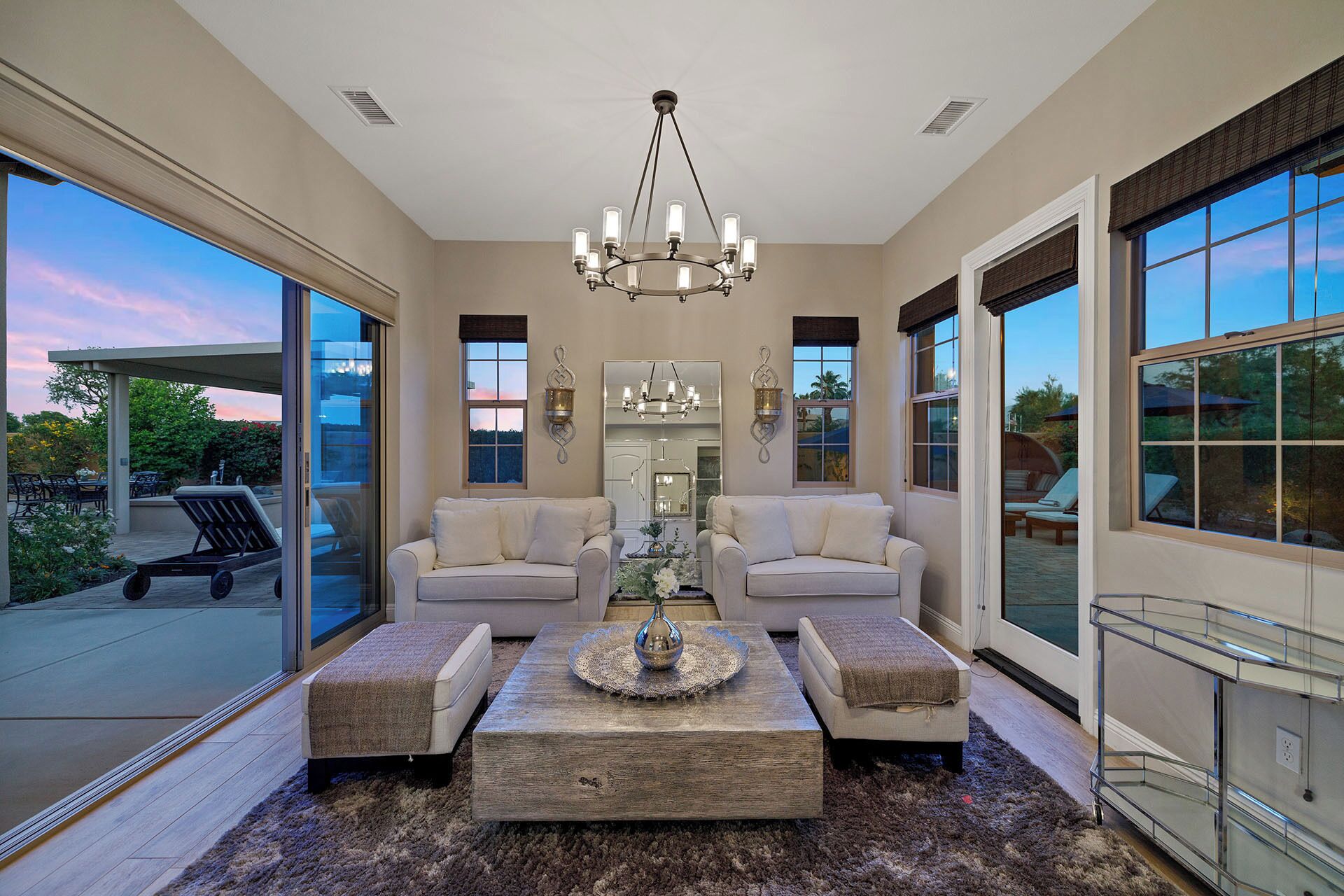 The living room opens up to your own private outdoor desert paradise with something for the entire group, did I mention stackable doors?? The beautifully landscaped backyard features an outdoor dining table, couch seating area with a 65` outdoor TV, fire pit w/seating, built in gas BBQ and more.