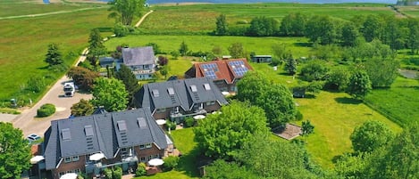 2-room apartment The 2-room apartment (about 49 m²) for 1-4 persons is located on the ground floor and has direct access to the furnished terrace in the garden overlooking the salt marshes of Lake Neuensien. The modern apartment for families or couples has a bedroom with king-size box spring bed, a living room with sofa (double sofa bed), an integrated fitted kitchen and a shower room. The fully equipped kitchen with dining area is integrated into the large living room. The apartment is equipped with smart TVs in living room and bedroom and free Wi-Fi. Smoking is not allowed in the apartment. This holiday apartment is also available for pet owners. Equipment: - Fully equipped kitchen - ceramic hob, oven, dishwasher, coffee maker, kettle, toaster - 1 bedroom with box spring bed (1.80 mx 2.00 m) - Smart TV's, radio - high-speed Internet, free Wi-Fi - safe - Direct access to the furnished terrace in the garden - Free parking space in front of the house - Pets are welcome (please specify when booking) Allergy-friendly amenities (no pets allowed) are also available