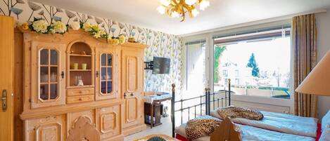 stops of the Lindau city bus. The comfortable apartment, which is generously sized for two people at over 60 m², is modernly furnished and leaves nothing to be desired. It consists of an entrance area, kitchen, combined living/dining area, bedroom, bathroom, guest WC, balcony and cellar room. The bright fitted kitchen is equipped with microwave, stove with ceramic hob and oven, fridge with separate freezer compartment, dishwasher and various electrical appliances, such as coffee machine, kettle and toaster. In the cozy living/dining area, a flat-screen TV with satellite connection, a Blu-ray player and a stereo system (with MP3 connection) provide entertainment. You will also find a separate workstation with telephone in the apartment. In addition to the bathroom, the apartment also has an additional guest WC. Furthermore, the apartment has a beautiful large balcony, which invites you to both sunbathe and relax. You will find a separate, private parking space for your car in the inner courtyard. The apartment is suitable for allergy sufferers and is rented exclusively to non-smokers. Unfortunately, pets are not allowed in the apartment. Your beds will be freshly made upon arrival; additional blankets and pillows are of course available on request. Towels and tea towels are provided.