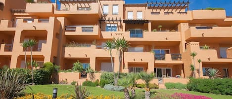 Ground floor two bedroom, two bathroom apartment in the very popular complex of Los Granados de la Duquesa. The apartment boasts a large terrace with sun all day, views to the swimming pool and the sea and access to the communal gardens. Large lounge with patio doors leading to the terrace, fully fitted kitchen and air conditioning throughout.