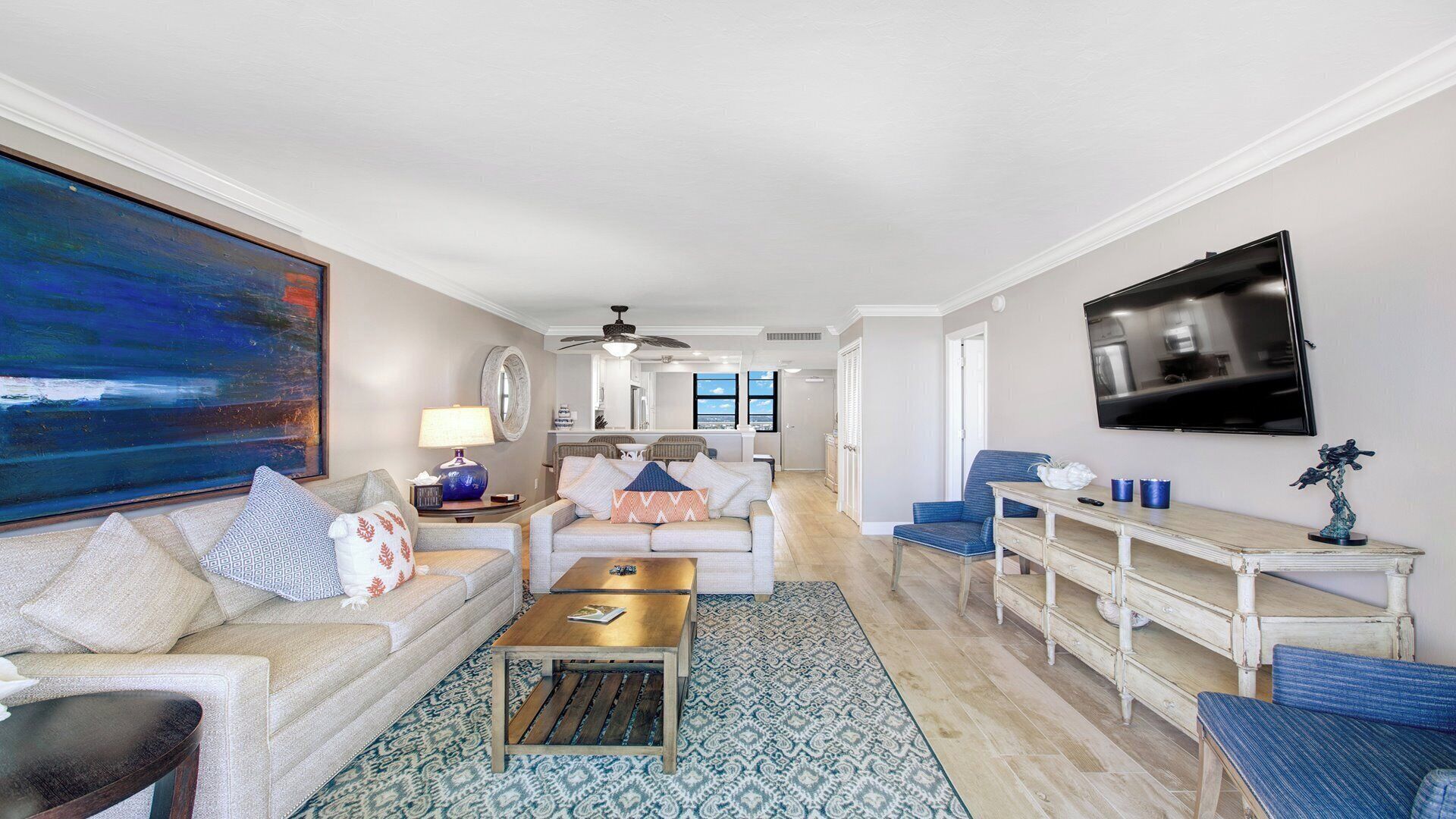 Step into the airy, modern oceanic-themed living room, where a plush couch that converts into a sleeper sofa and inviting chairs surround the television. Sliding glass doors frame the turquoise waters beyond and open directly to your private, unit-wide balcony—the ultimate front-row seat for Marco Island’s famous sunsets. Out here, a table and chairs invite you to linger over morning coffee or evening cocktails as the sky shifts from gold to pink to deep violet.