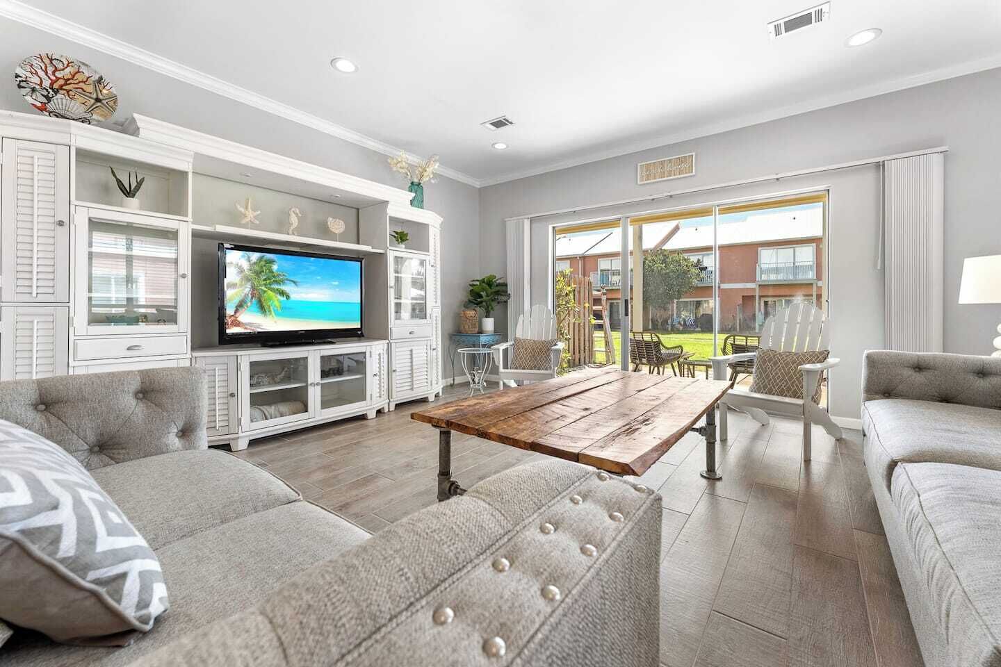 Finally, the remaining sleeping accommodations are all on the top floor of the home. There's a family loft overlooking the Gulf of Mexico with a couch, two armchairs, a flatscreen TV, gulf-front balcony, and a king-sized bed. Additionally, the family loft also features a bunk nook with twin/twin bunk beds in addition to an ensuite bathroom with a walk-in shower. All in all, Emerald Belle is the perfect home to stay in if you're planning a large multi-family vacation.a