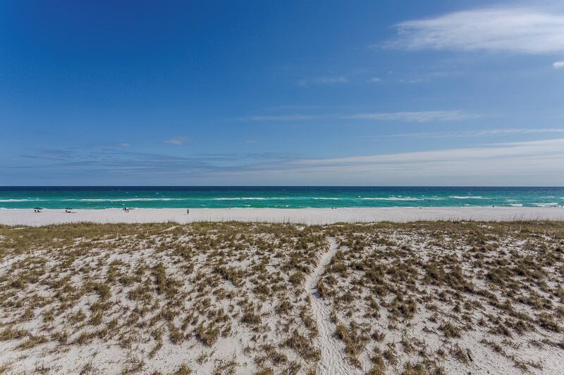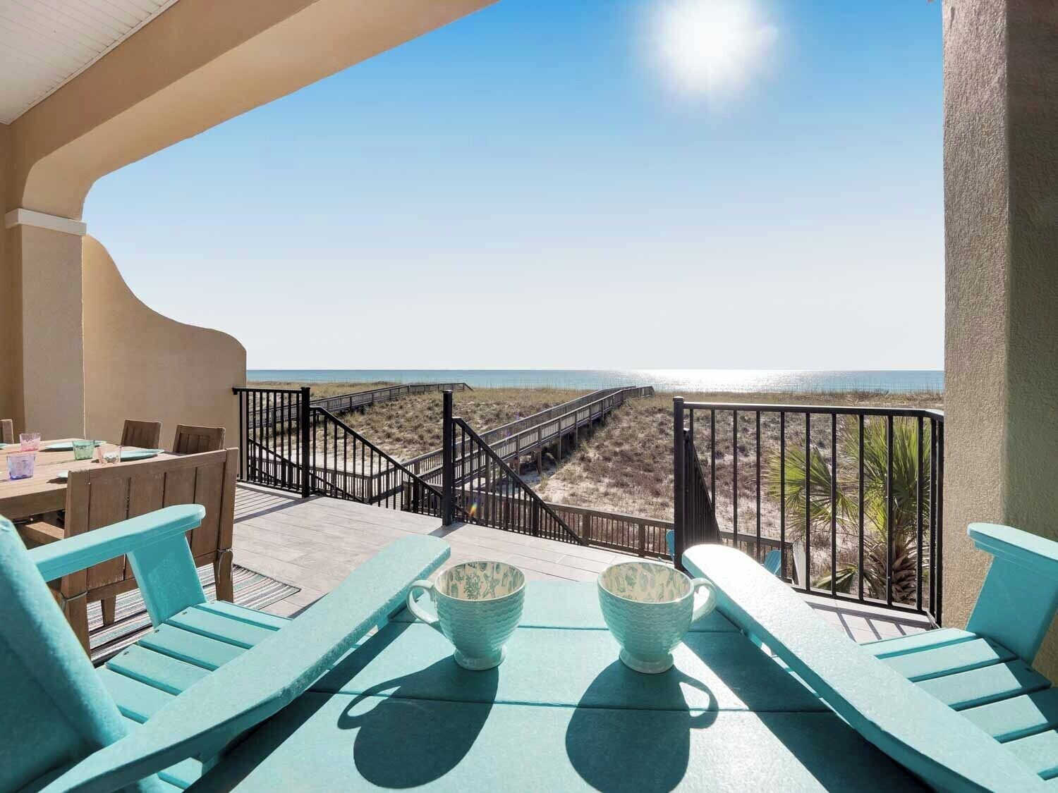 The main level boasts an expansive great room with a large sectional and an 82” TV. The TV is equipped with YouTube TV so you won't have to miss the gorgeous sunset to watch your favorite show. The wall-to-wall sliding glass doors provide a fantastic view of the beach and access to a large patio with plenty of room to kick back, relax and watch the waves. The deck is equipped with a loveseat, coffee table, two chairs, and two outdoor loungers for soaking in the rays. A gas grill is available for grilling the perfect dinner. At the bottom of the stairs is a walkway to the white sandy beach and green water of the Emerald Coast. The home is directly on the beach. The boardwalk, stairs, porch tile and landing are new.