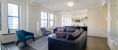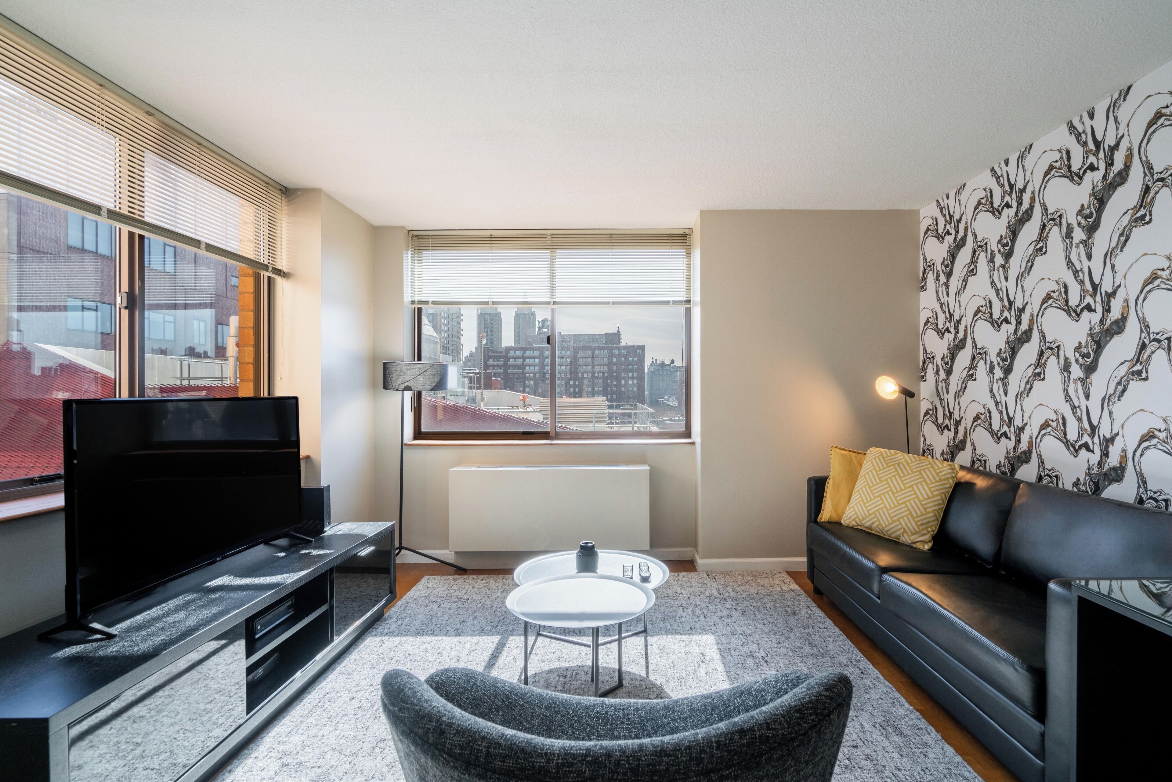 This stylishly decorated one-bedroom is located in a classic Upper West Side building. The apartment features distinctive contemporary furnishings, hardwood flooring, oversized windows, and a fully equipped kitchen with quartz countertops. All beds provided are fitted with plush linens and pillows. All Furnished Quarters apartments include 24/7 guest service.