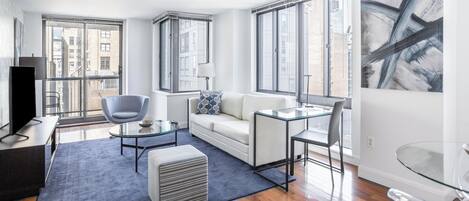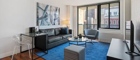 This modern, stylish one bedroom is located in a luxury apartment building. The one bedroom features a fully equipped kitchen, a private balcony, hardwood floors and complimentary WiFi. The bed provided are queen size, fitted with plush linen sheets and pillows. All Furnished Quarters apartments include 24/7 guest service.