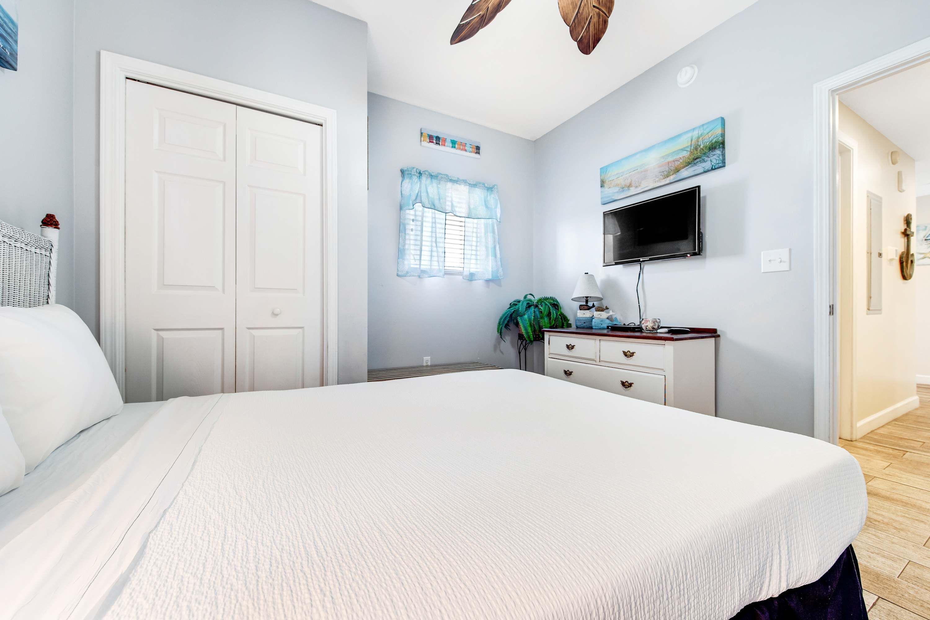 This 2 bedroom 3 bathroom unit is so cozy and sleeps 8 guests comfortably. Both bedrooms have a flat screen TV, a closet, and private access to your own bathroom. One bedroom has a King sized bed, and the other has a Queen. The two private bathrooms have a standard layout, one having a stand up shower and the other having a combination shower/tub. Tucked off in the hallway is bunk beds for the little ones and the third bathroom is located right next to beds. Once you make your way into the living room you are met with a breathtaking view of the ocean. The kitchen is stocked with all white appliances and has everything you need to make a delicious meal.
