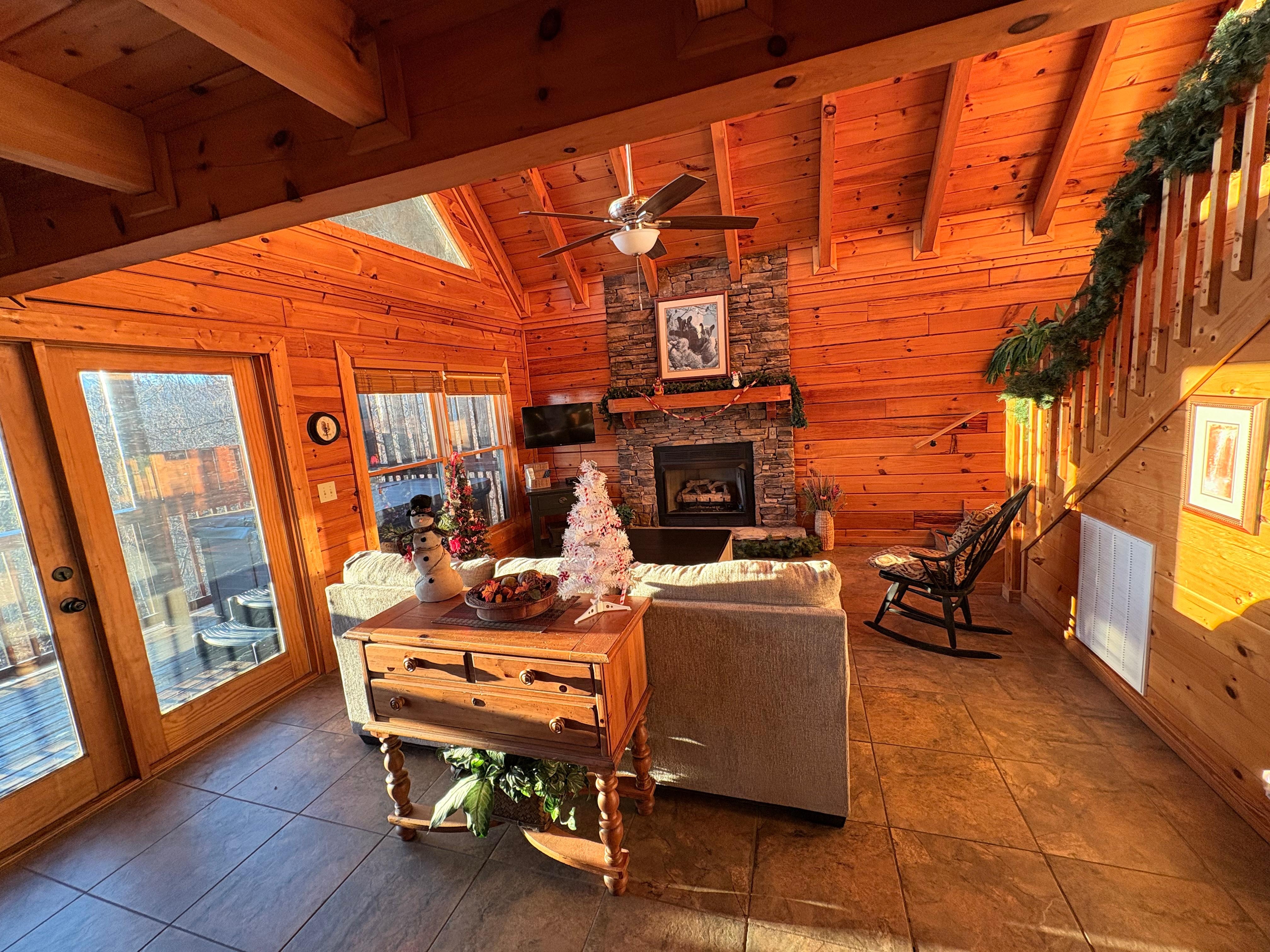 In the center of Pigeon Forge, this lovely cabin provides the ideal getaway for your upcoming trip. As you step inside, you'll be greeted by a cozy living room with a crackling fireplace, inviting you to unwind and soak in the serene atmosphere.
