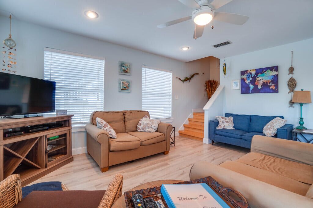 The first floor boasts a King Primary Suite with Gulf views, including an ensuite bathroom with double sinks. Primary suite also includes French door access to a 2nd large deck. The third bedroom has lovely sea views and a King bed, also with direct deck access. The 4th bedroom has a charming Full-over-Full bunk bed with a twin trundle. Bedrooms #3 and #4 share a hall bath and all bedrooms have a flatscreen TV with Roku device to allow for streaming. A laundry closet is also located on first level for your convenience.