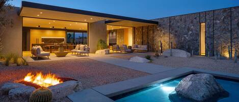 The sparkling pool and spa takes center stage, inviting long, sun-soaked afternoons or peaceful evening dips beneath the desert sky. Optional pool heat is available for $65 per night. We recommend adding heat between October and May. With this option, your pool will be preheated to a comfortable 83°F before your arrival. You will also be able to heat the spa, which is included in your booking. Daily pool heating fees are based on natural gas prices in California and the pool's size.