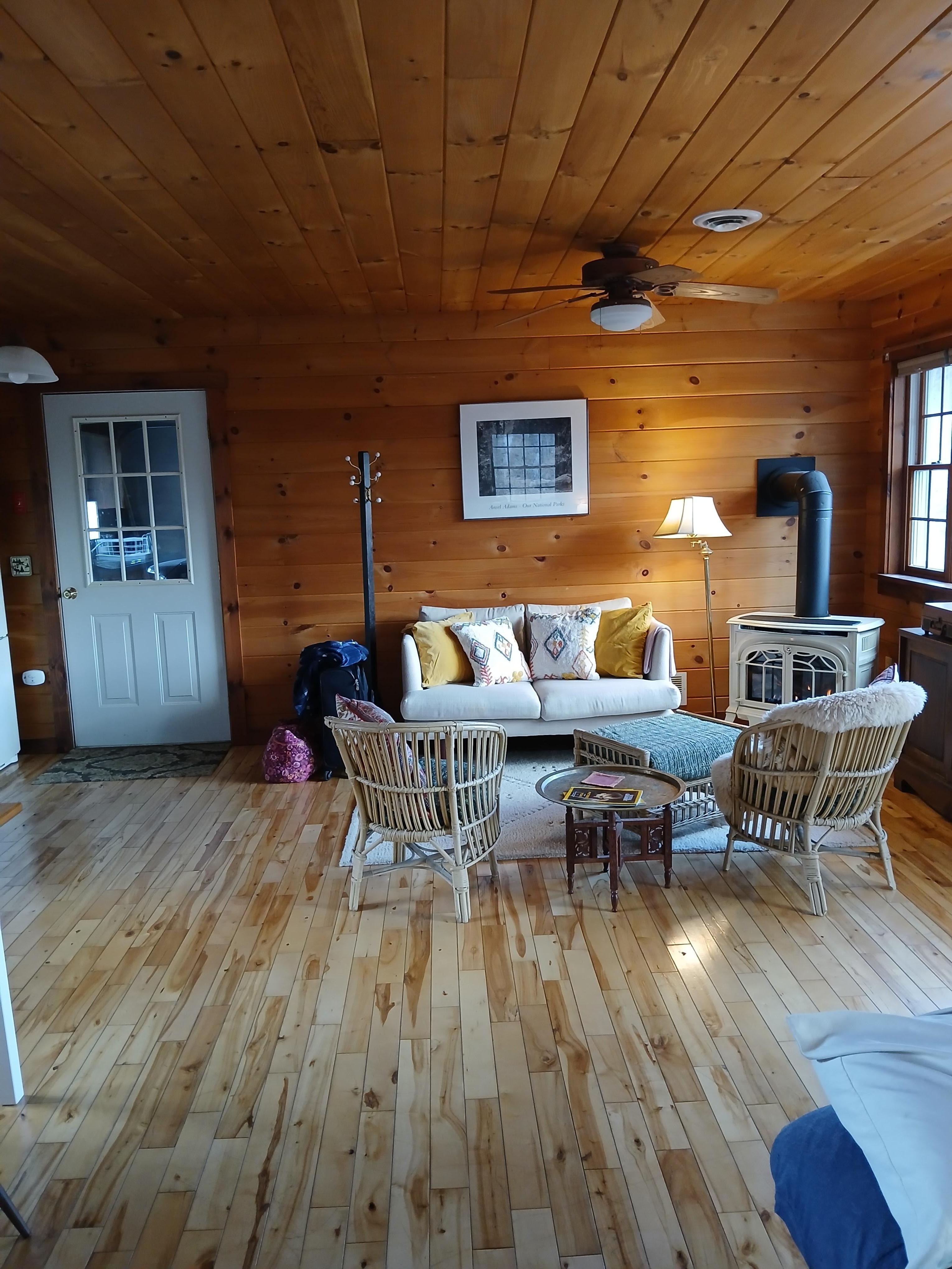 The cabin is heated by a gas stove - providing the cozy ambiance of a woodstove with the luxury of a thermostat control! A record player is enabled with bluetooth to play your favorite playlists. High-speed internet allows you to check on emails, make WiFi-enabled calls, or stream shows. A wall of south-facing windows provides the perfect place to watch snow fall over the adjacent stream.