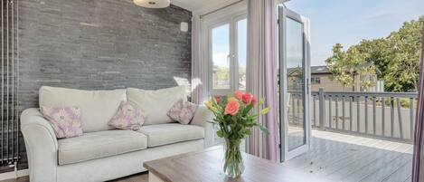 Spacious lodge with one king-size four poster and one double both with stylish en suite shower and two twin. Large bathroom with bath and overhead shower. Contemporary open-plan living space including solid wood floors and a rustic electric woodburner in the lounge, modern kitchen, breakfast bar and spacious dining area. Patio doors leading to a spacious decking area perfect for al fresco dining with outdoor hot tub. Ideal for a relaxing break with large families or large groups. Pets allowed in selected accommodation only.
