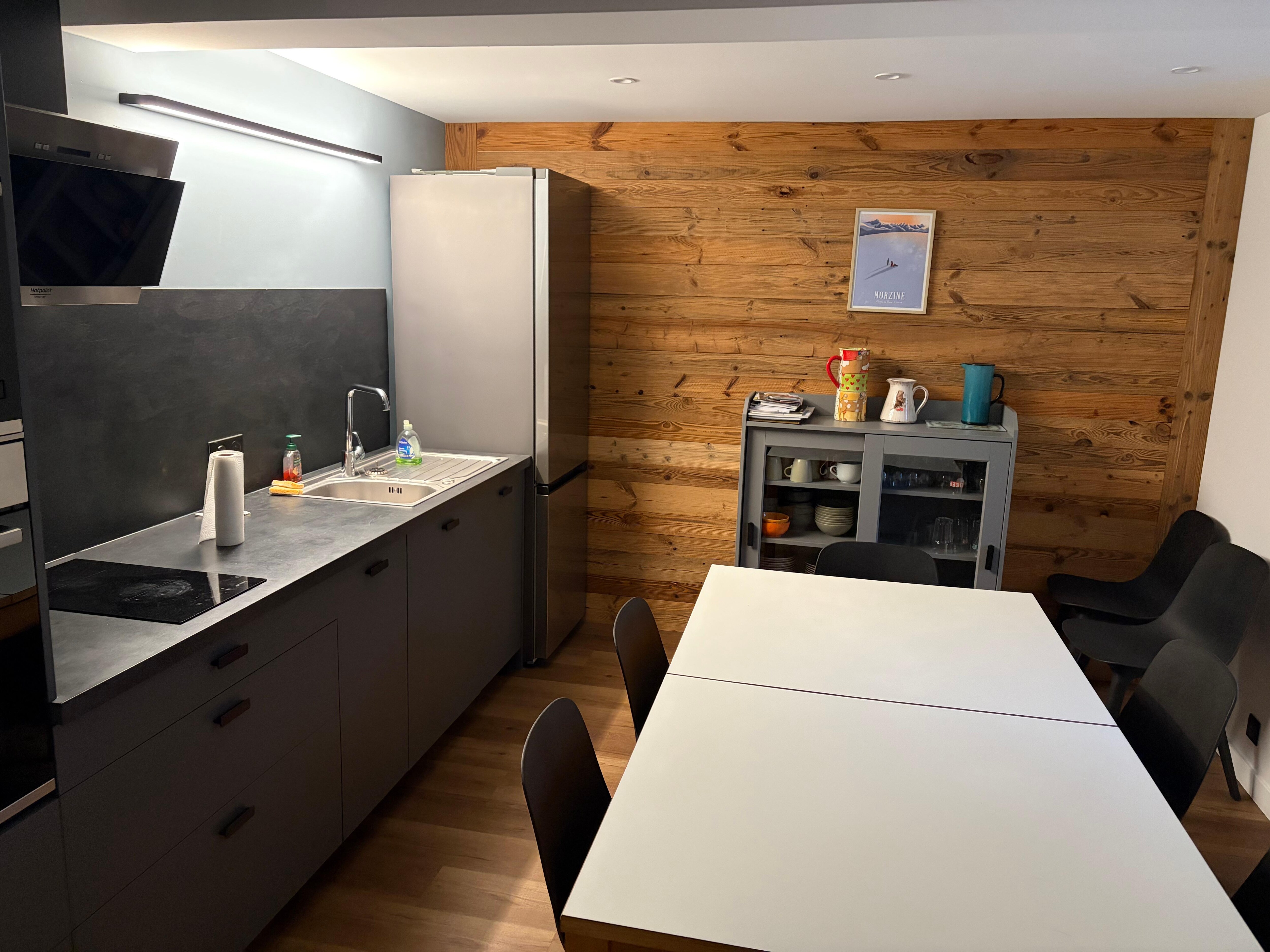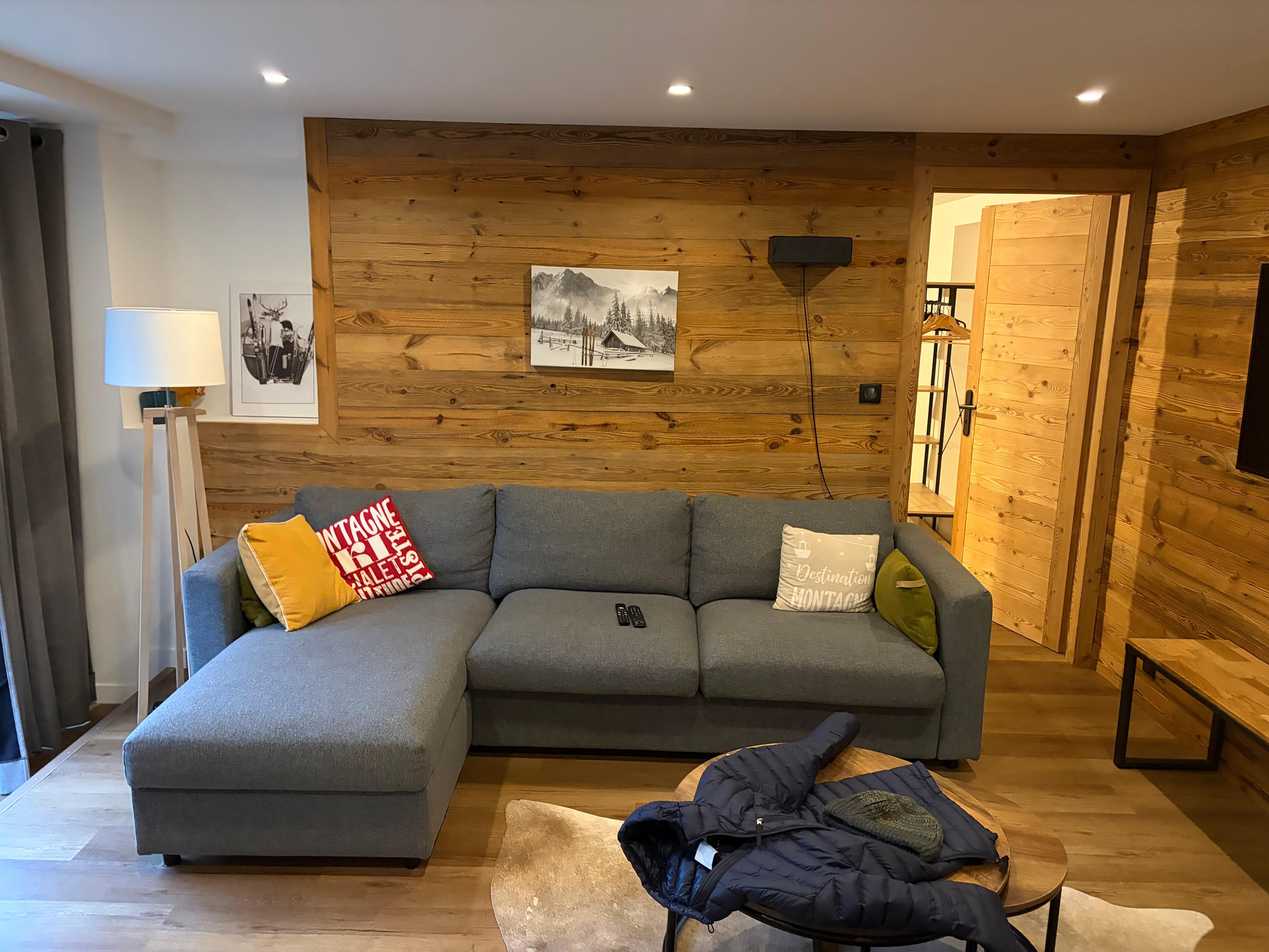 The main room consists of a fully equipped kitchen (ceramic hob, oven, microwave, dishwasher, refrigerator with freezer...), open to a friendly dining area. The spacious and welcoming living room invites relaxation after a day in the mountains, with its sofa bed and TV.