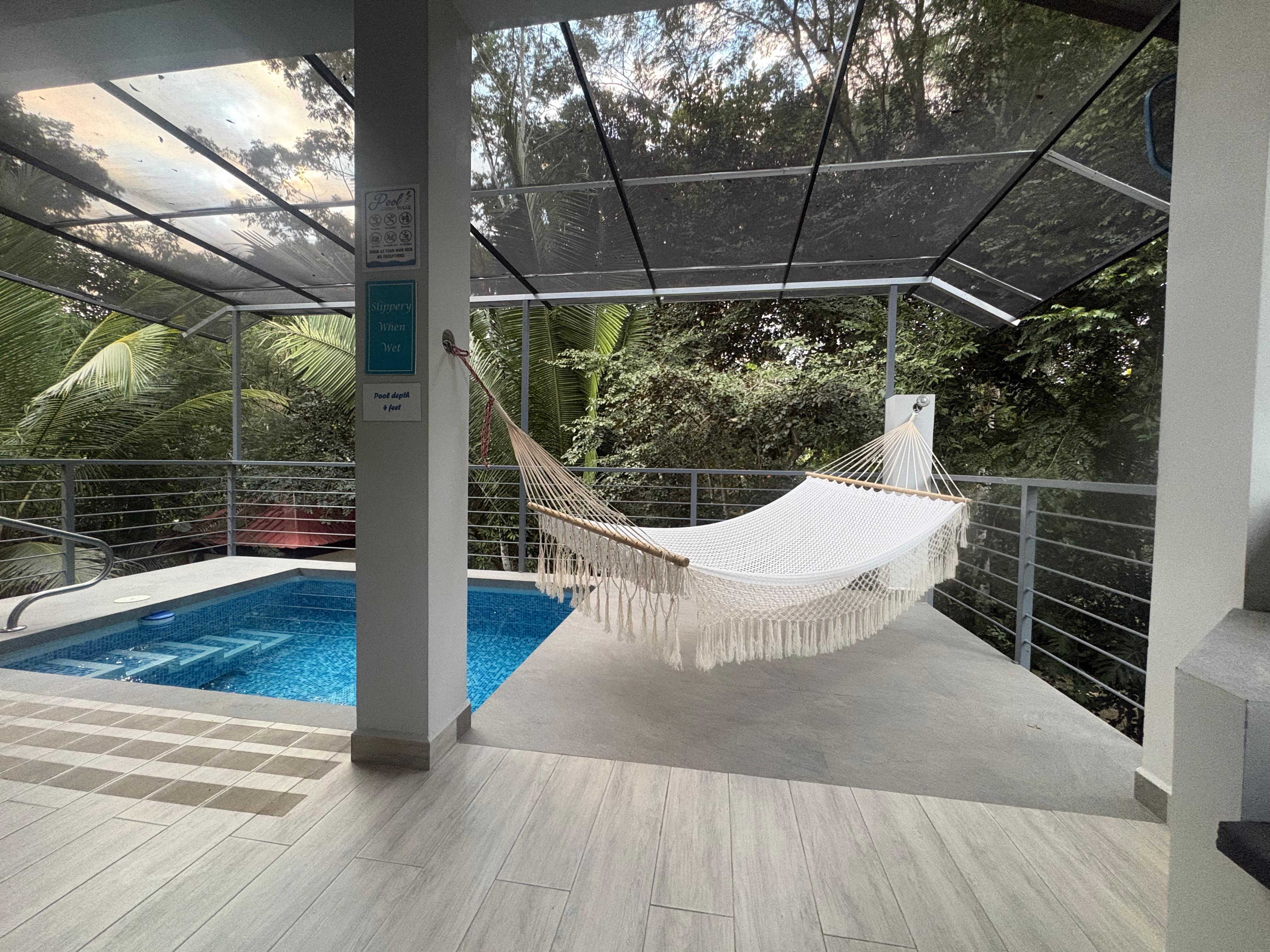 The lanai is very comfortable with its “L” shaped sofa, outdoor dining table, hammock, and Webber BBQ. This is the place to be! Lounging is a priority at Cascade Palm with toucans, parrots, kinkajous, garobos, and other jungle animals to be seen.