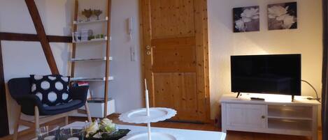 "Lindenstraße", 2-room apartment 55 m2, on the top floor. Renovated in 2024, modern and cosy furnishings: living/dining room with sloping ceilings with 1 sofabed, satellite TV and flat screen. Exit to the balcony. With sloping ceilings, 1 room with 1 double bed. Kitchenette (2 hot plates, toaster, kettle, microwave, freezer, electric coffee machine) with dining table. Shower/WC. Oil heating. Balcony. Terrace furniture, balcony furniture, deck chairs (2). Facilities: children's high chair, baby cot, hair dryer. Internet (WiFi, free). Parking (roofed) at the house. Please note: smoke alarm, fire extinguisher.