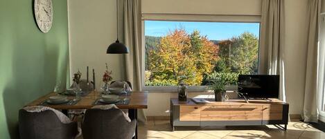Our cozy, modern and lovingly furnished 45 square meter apartment is barrier-free and is located in a 2-family house in the Black Forest style. It has a barbecue house and a sunbathing lawn. The apartment is located in Schönwald, very close to the Triberg waterfalls, at the end of the village in a quiet cul-de-sac and only 300m from hiking trails and the cross-country ski trail. A parking lot is available free of charge. It has a separate entrance, 2 rooms (living, dining, cooking area, separate bedroom, bathroom with walk-in shower and a hallway), is ideal for 2 to 4 people or a family with 2 children. There is a small Edeka supermarket 200m away and a connection to public transport, so that all excursion destinations are easily accessible. For example, you can visit the Triberg waterfalls, the local history museum, the railroad adventure trail, the Black Forest Railway, the clock museum, Lake Titisee, the Titisee bathing paradise, the Feldberg etc.