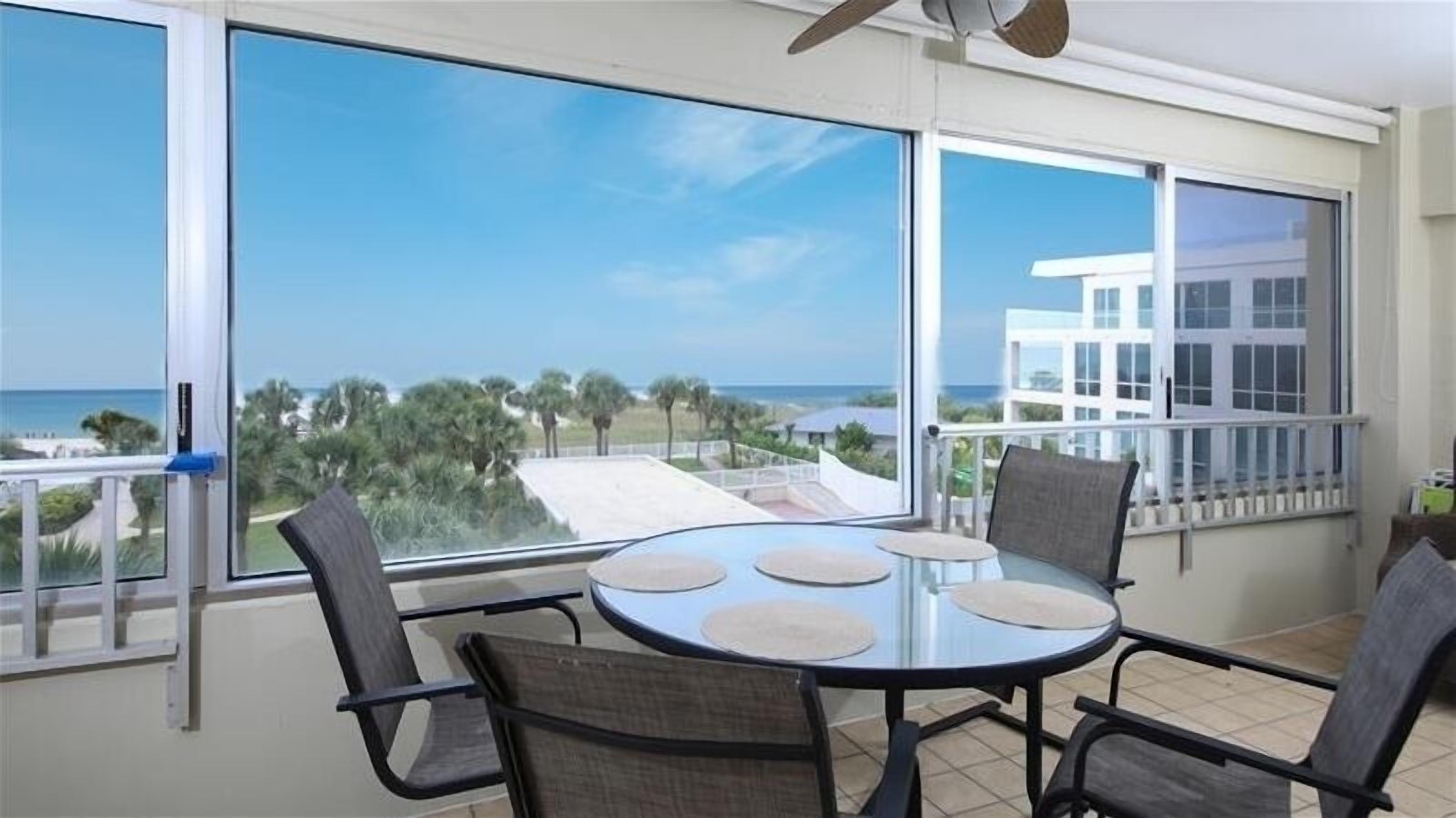 The lanai has an additional dinette, a couch, reading space, ceiling fans, and stunning open views of Crescent beach.