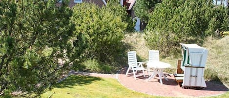 Terrace with garden furniture and beach chair in the garden area surrounded by dunes.