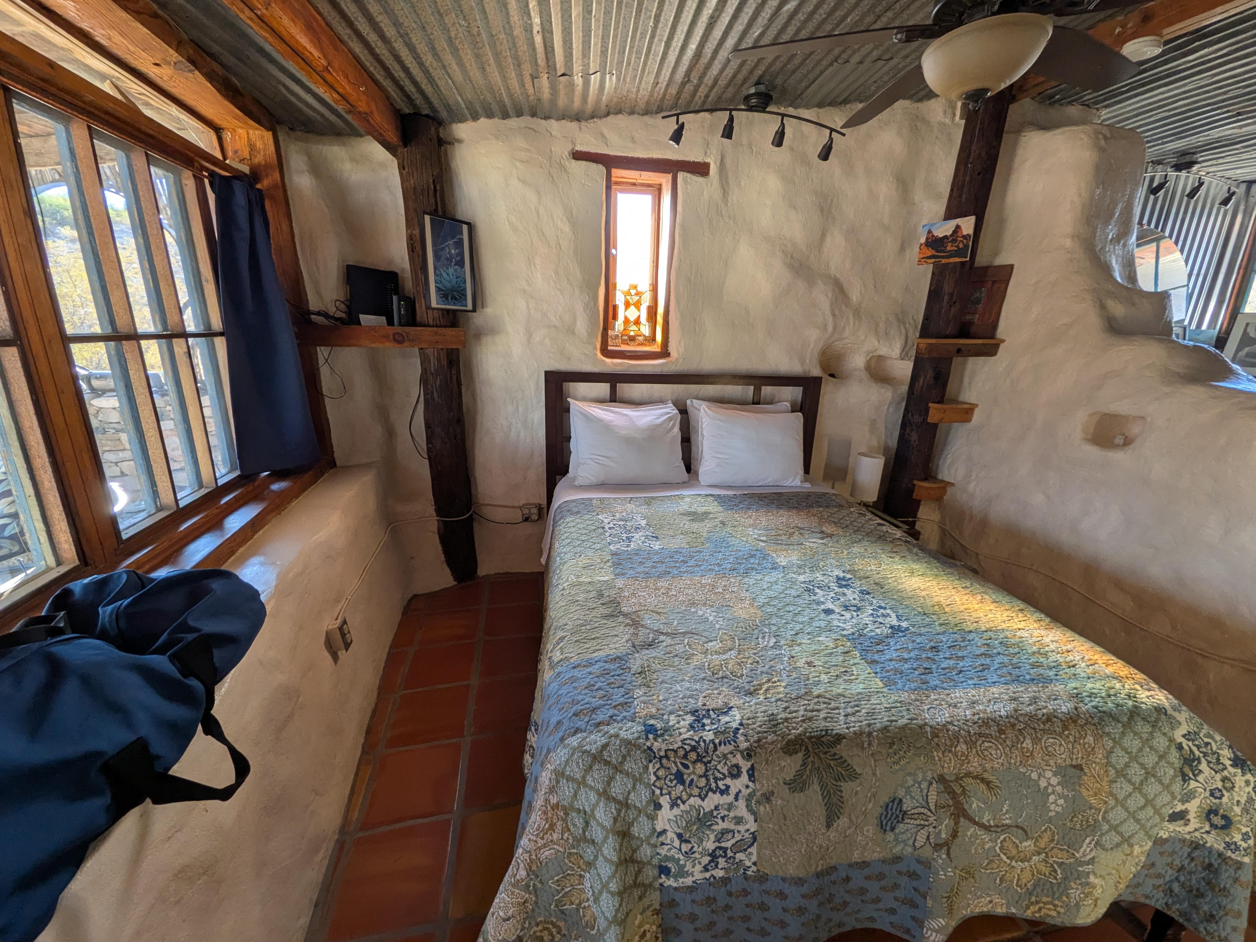 The Cozy Bedroom - This simple hideaway behind the kitchen is my favorite room in the house, but it is tiny. The full-size futon just fits in the space. There is beautiful ceiling of vigas and sotol, a saltillo tile floor, and a little nicho for your knick-knacks. It maintains the tiny windows that were part of the original design of the minersâ home.